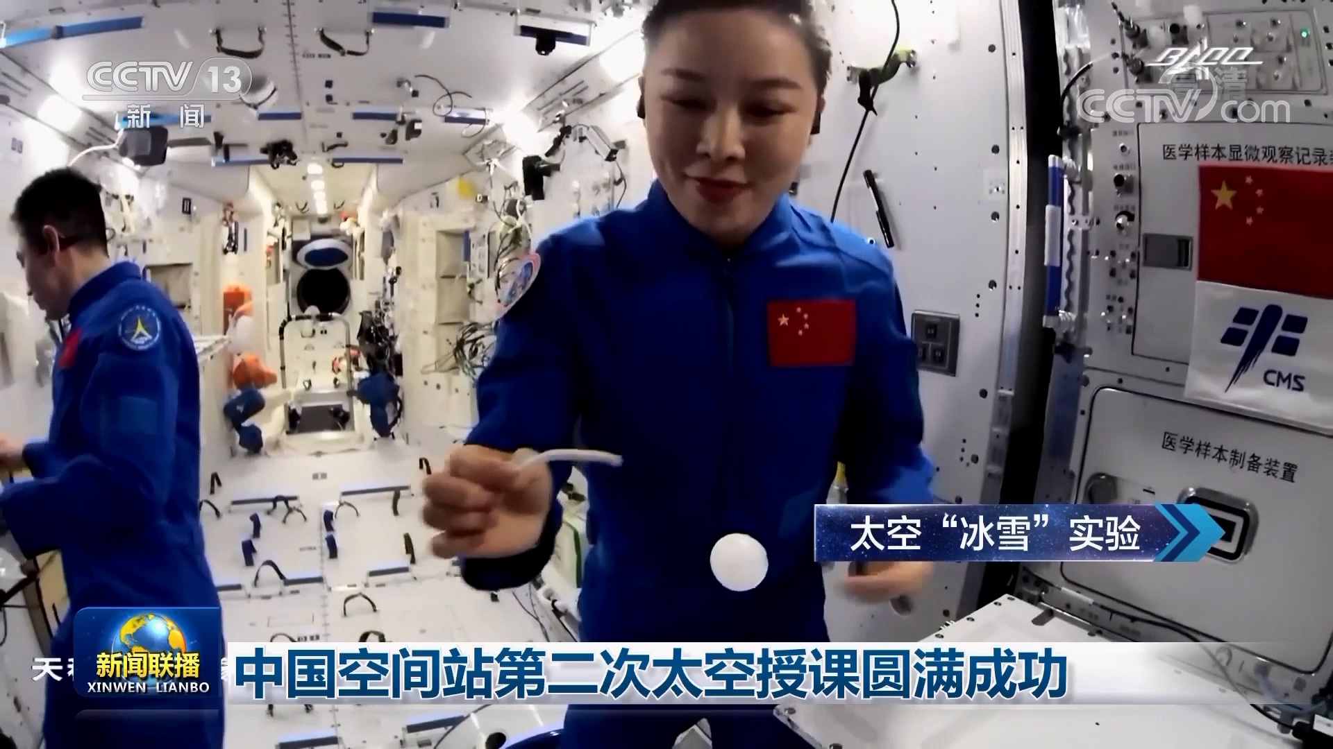 这是太空“冰雪”实验,向同学们演示失重状态下的饱和液体结晶现象。