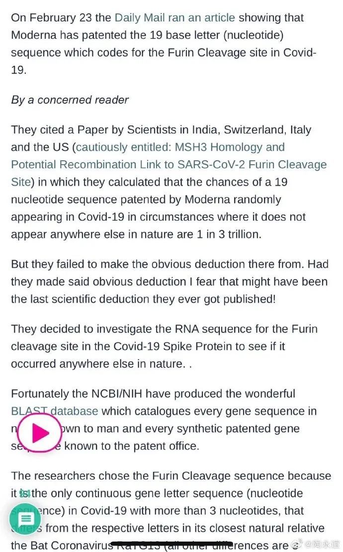 翻译一下,就是说目前造成全球疫情的新冠病毒,不是美国莫德纳公司创造的几率只有三万亿分之一。