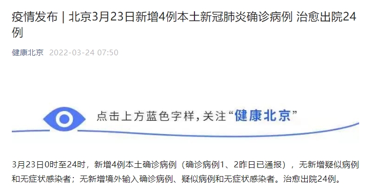 疫情发布丨北京3月23日新增4例本土新冠肺炎确诊病例 治愈出院24例