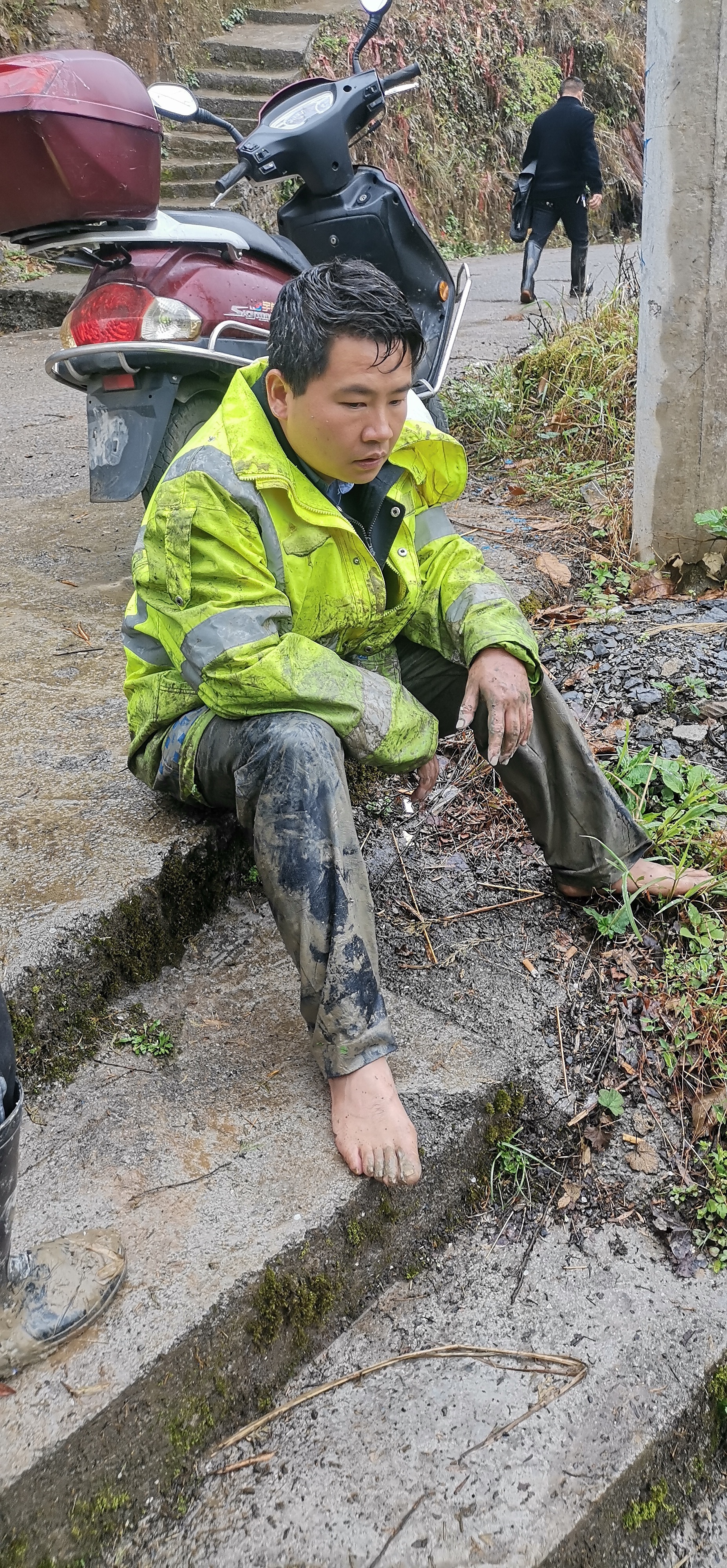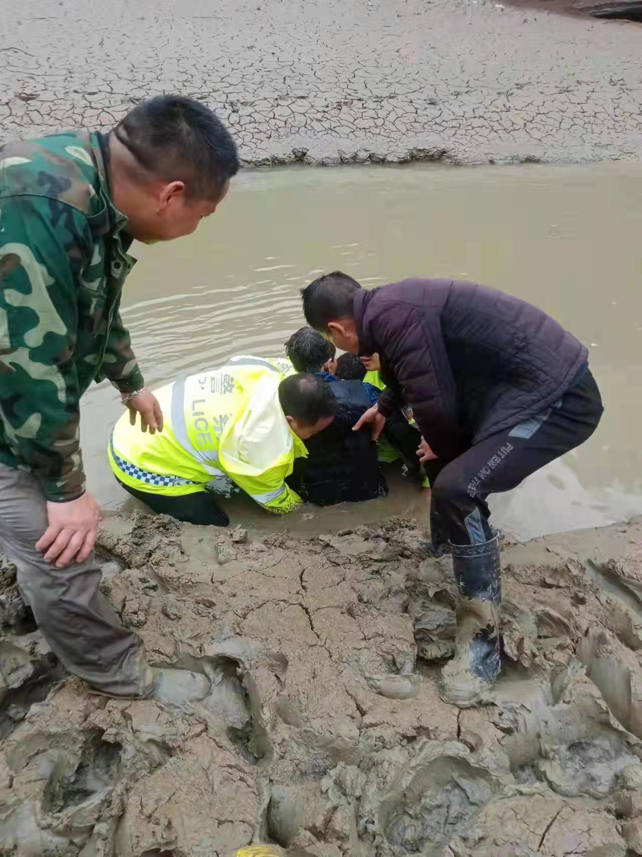 淤泥松软,很快就没过救援人员的膝盖,救援人员们要不断用力调整让自己不会下沉。因为担心伤到老人,救援人员不敢使用工具,只得徒手刨泥。周边的村民也赶来帮忙救援。经过众人20多分钟的不懈努力,终于将赵婆婆成功从淤泥中“拔”出,送来等候在路边的救护车。此时,入河救人的几人已成了“泥人”。