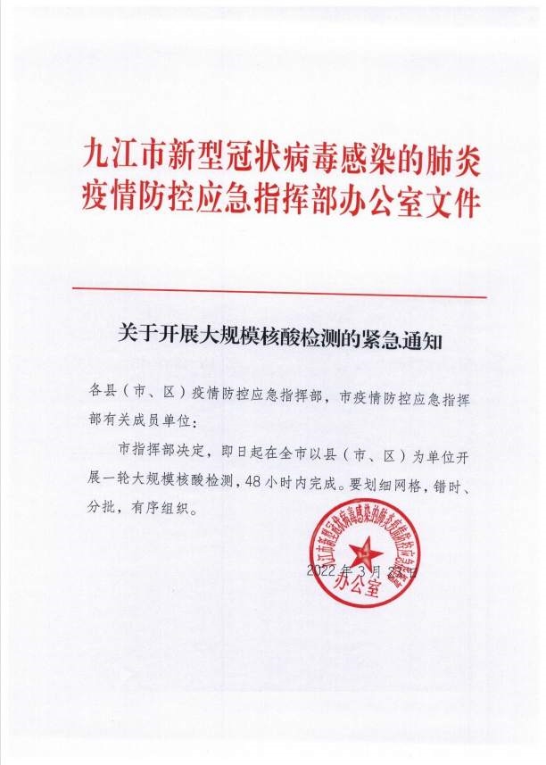瑞昌市预计3月24日上午10:00将展开第二轮核酸检测,所属九江市即日起在全市范围内开展一轮核酸检测。