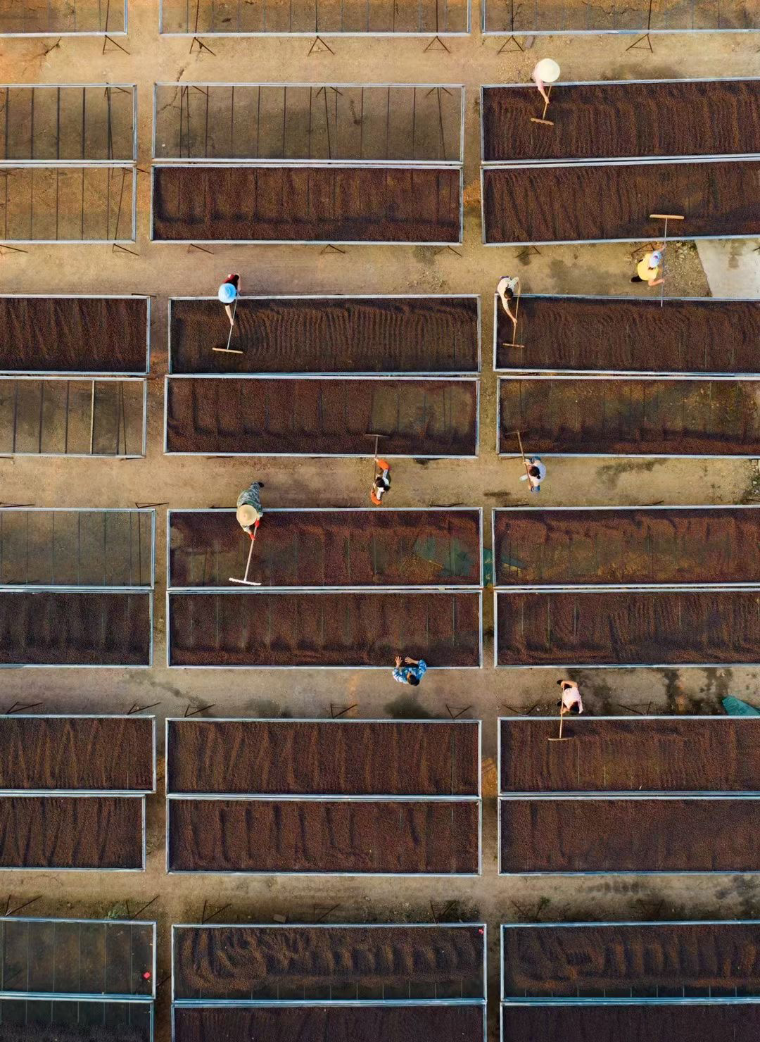 新华社照片,昆明,2022年3月24日 春来远山“魔豆”香——一杯咖啡里的山乡巨变 这是云南普洱市思茅区一家企业的咖啡晒场,工作人员在翻晒咖啡(资料图片)。 (配本社同题文字稿) 新华社发