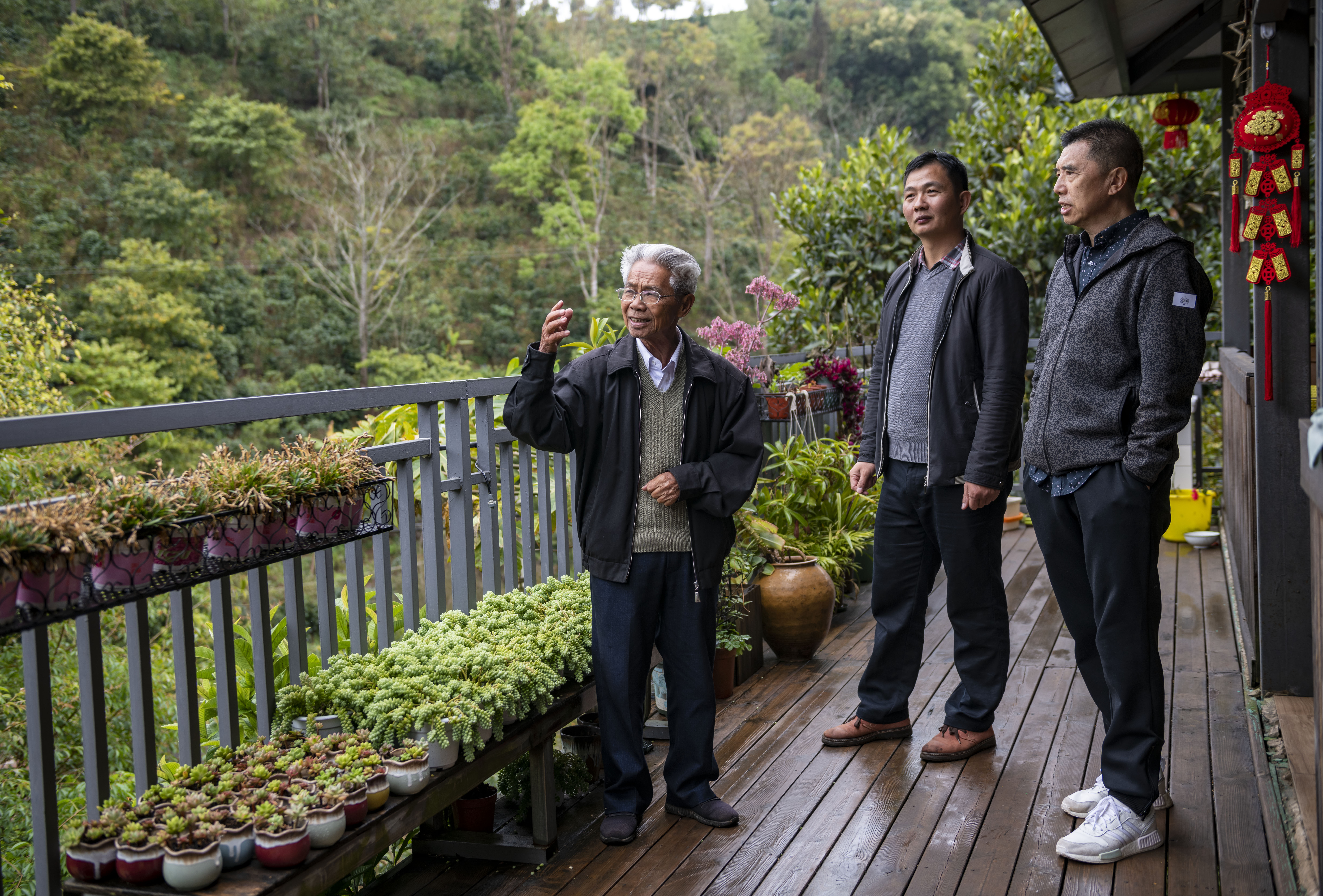 新华社照片,昆明,2022年3月24日 春来远山“魔豆”香——一杯咖啡里的山乡巨变 80岁的高级农艺师廖秀桂(左一)在云南普洱市思茅区小凹子咖啡庄园内向两名游客做介绍(2月22日摄)。 (配本社同题文字稿) 新华社记者 陈欣波 摄