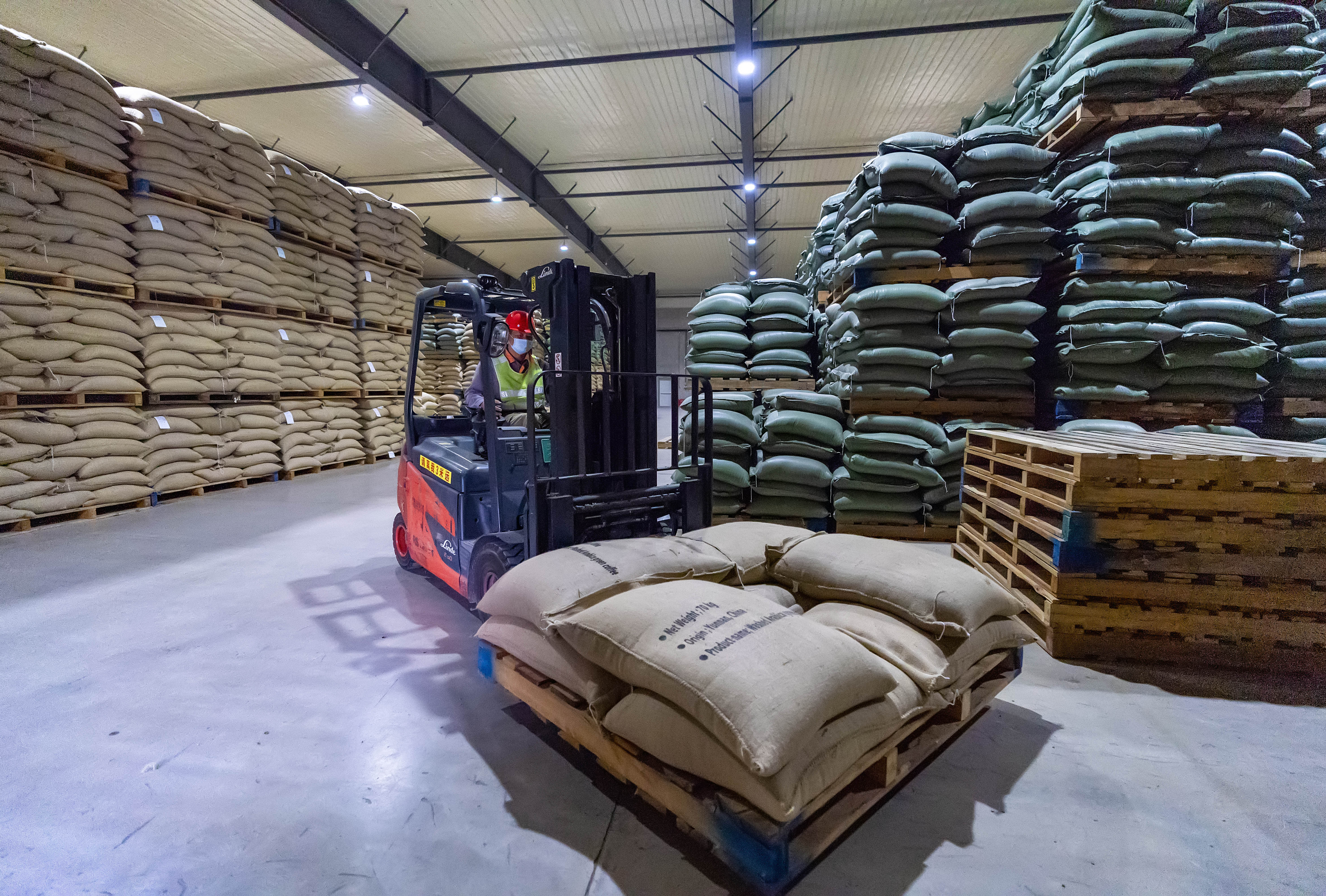 新华社照片,昆明,2022年3月24日 春来远山“魔豆”香——一杯咖啡里的山乡巨变 工作人员在云南普洱雀巢咖啡中心仓库内工作(2月22日摄)。 (配本社同题文字稿) 新华社记者 陈欣波 摄