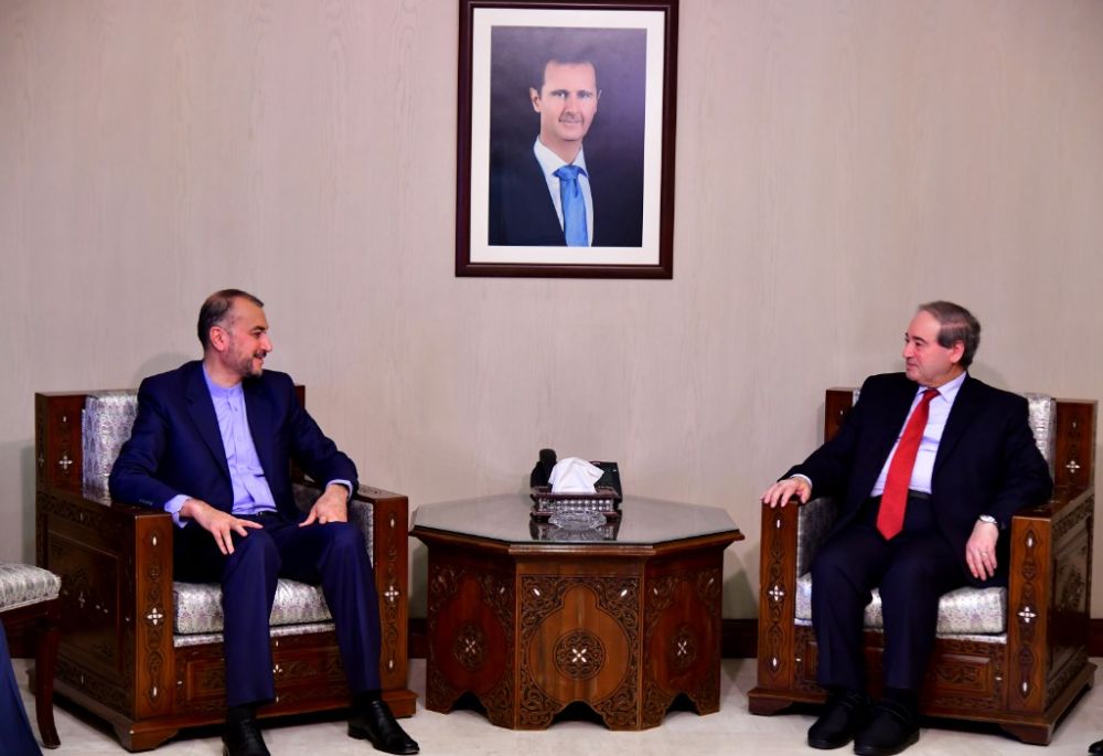3月23日,伊朗外长阿卜杜拉希扬(左)与叙利亚外长梅克达德在叙利亚首都大马士革举行会谈。新华社发(阿马尔·萨法尔贾拉尼摄)