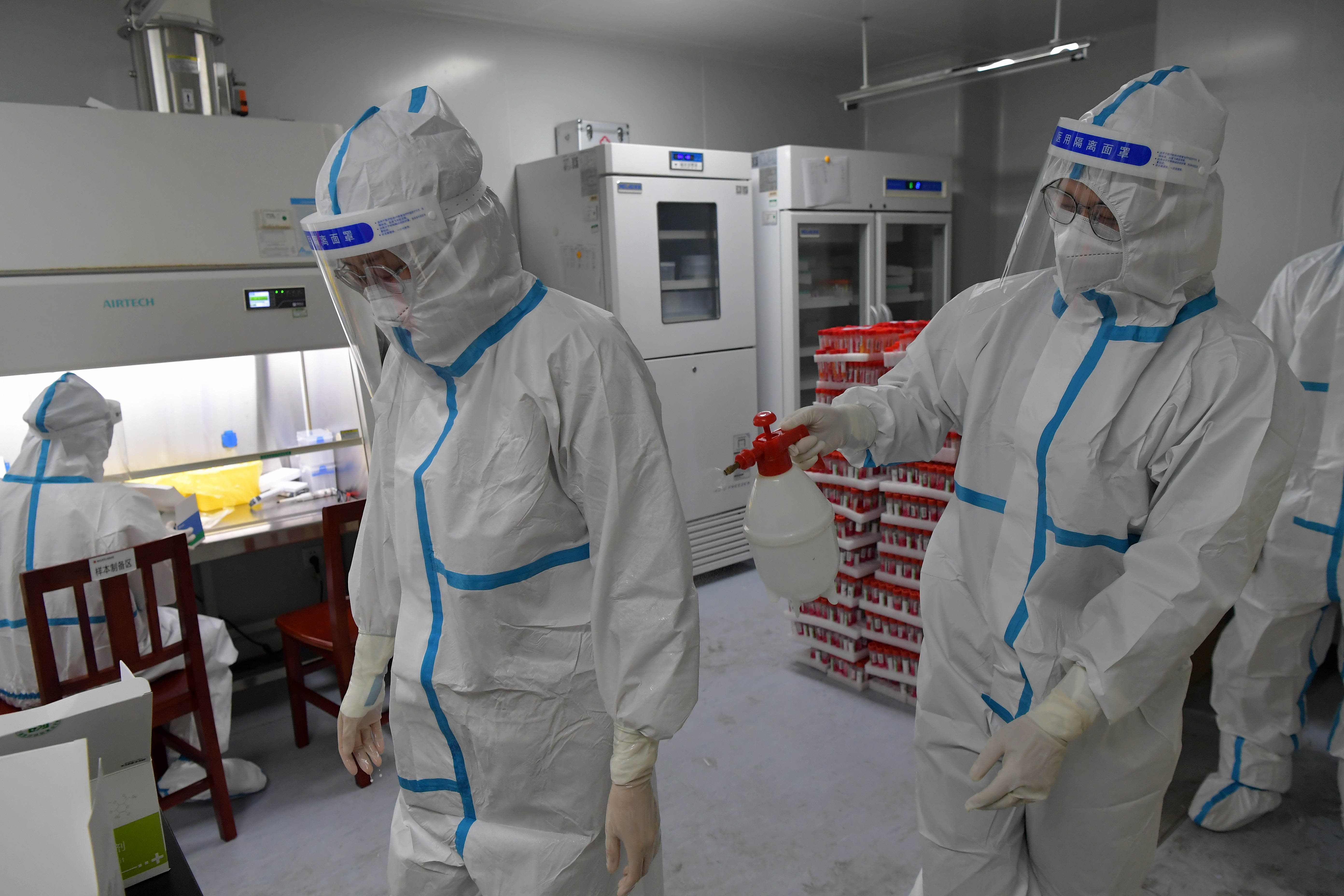 新华社照片,南昌,2022年3月24日 核酸检测室里的“缉毒人” 在南昌大学二附院医学检验中心核酸检测实验室,核酸检测员在互相消毒(3月23日摄)。 在抗击新冠肺炎疫情最前沿,核酸检测员是近距离与病毒战斗的幕后英雄,检测室里的“缉毒人”。 从3月17日开始,江西南昌大学二附院28名经验丰富的检测员组成核酸检测队,每天分3班不停歇地进行核酸检测。核酸检测工作是一项技术要求高、风险大、手工操作环节多的精细活,每一个环节都要求严谨细致,全神贯注,不能出现丝毫差错,队员们严格按照操作规范,寻找病毒的“蛛丝马迹”。截至3月22日,他们共完成南昌市第一、二、三轮核酸检测标本4.5万余份,发出核酸检测报告48万余份。 新华社记者 彭昭之 摄