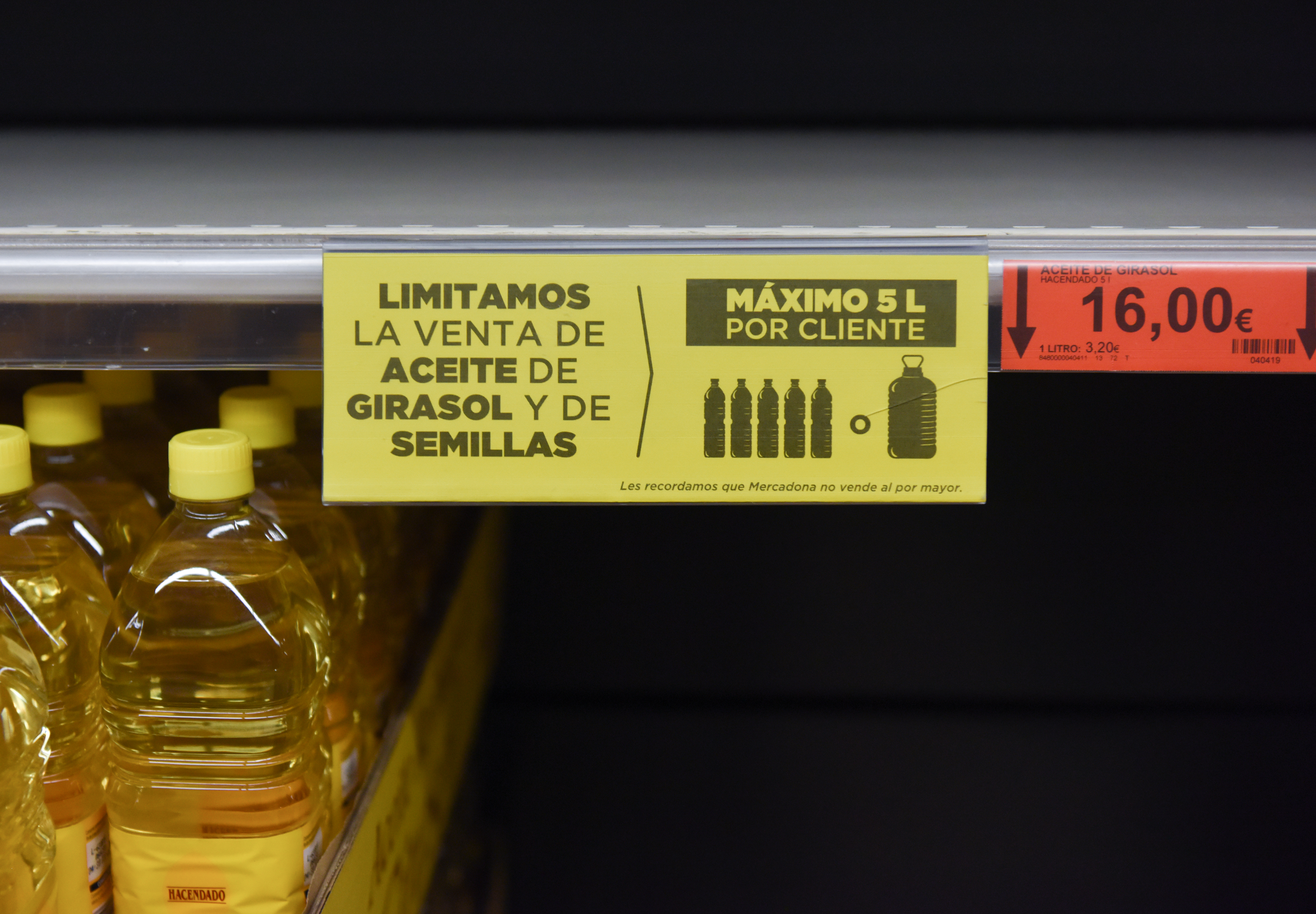 新华社照片,卡塞雷斯(西班牙),2022年3月24日 (国际)(3)欧洲经济民生受创 这是3月23日在西班牙卡塞雷斯一家超市内拍摄的葵花籽油限购标签。燃油价格上涨已经影响到西班牙部分商品的市场供应。 加油站排起长队,运输公司经营困难,上班族拼车通勤……随着西方不断升级对俄制裁,这些情形在欧洲多国出现。能源价格上涨也波及食品、日用品等与生活息息相关的领域。 新华社发(古斯塔沃·巴连特摄)