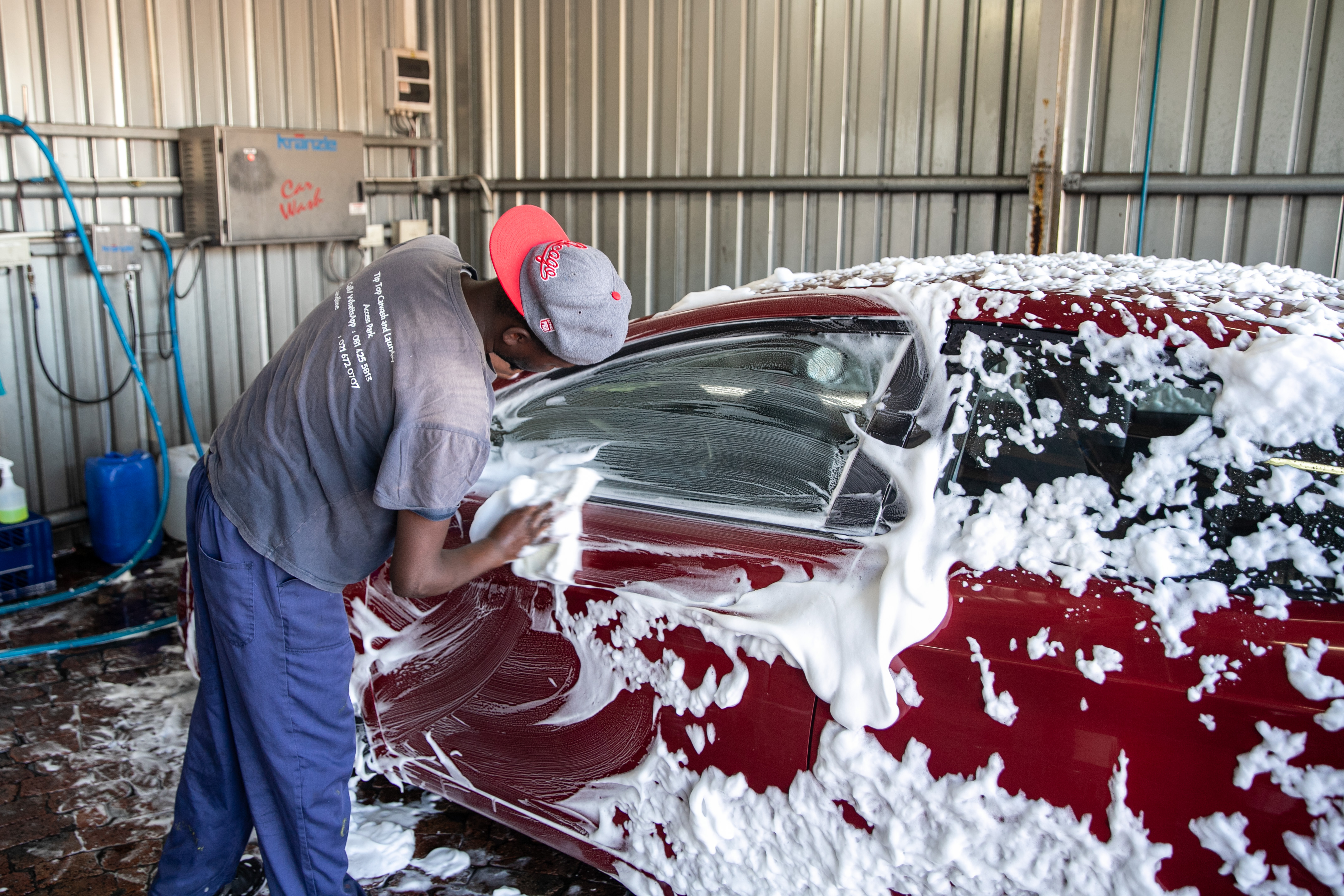 新华社照片,开普敦,2022年3月24日 (国际·图文互动)(3)通讯:南非开普敦在断水危机中警醒 3月19日,在南非开普敦,洗车店员工清洗车辆。 (配本社同题文字稿) 新华社记者 吕天然 摄