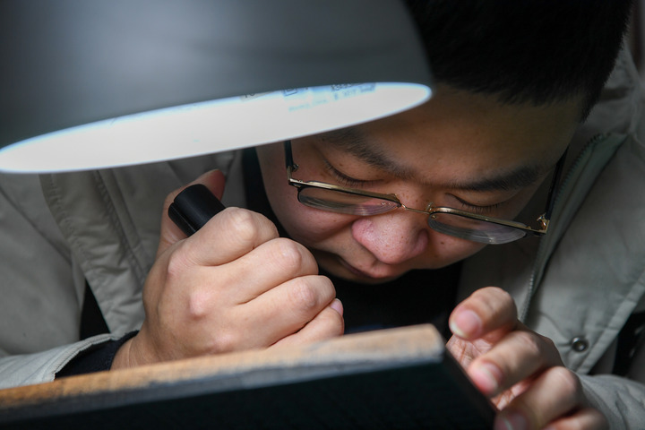 王康在工作台前进行雕版木板镌刻(2月21日摄)。