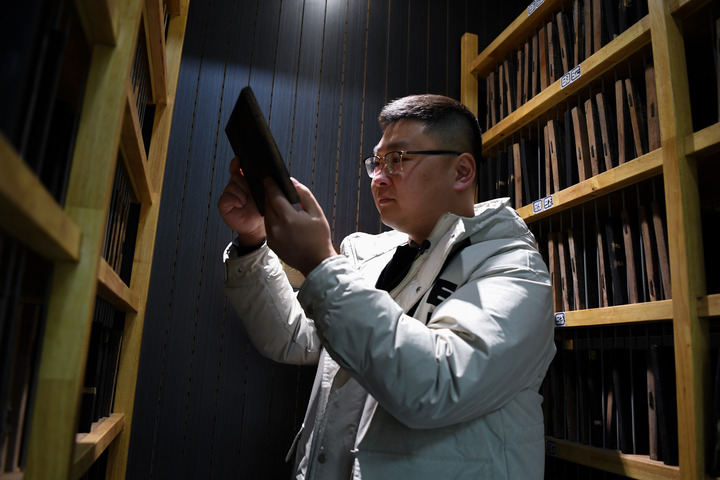 王康在金陵刻经处经版楼内整理经版(2月21日摄)。