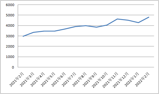 2021年2月-2022年2月中国进口保税航空煤油到岸价格走势图