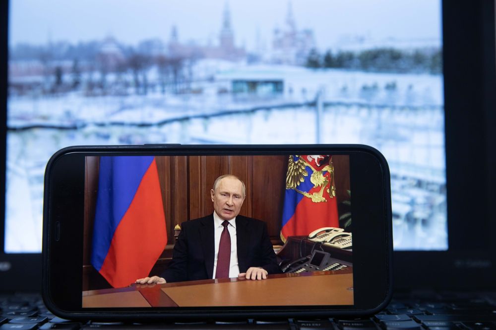 这是2月24日在俄罗斯首都莫斯科拍摄的俄总统普京发表电视讲话的画面。新华社记者白雪骐摄