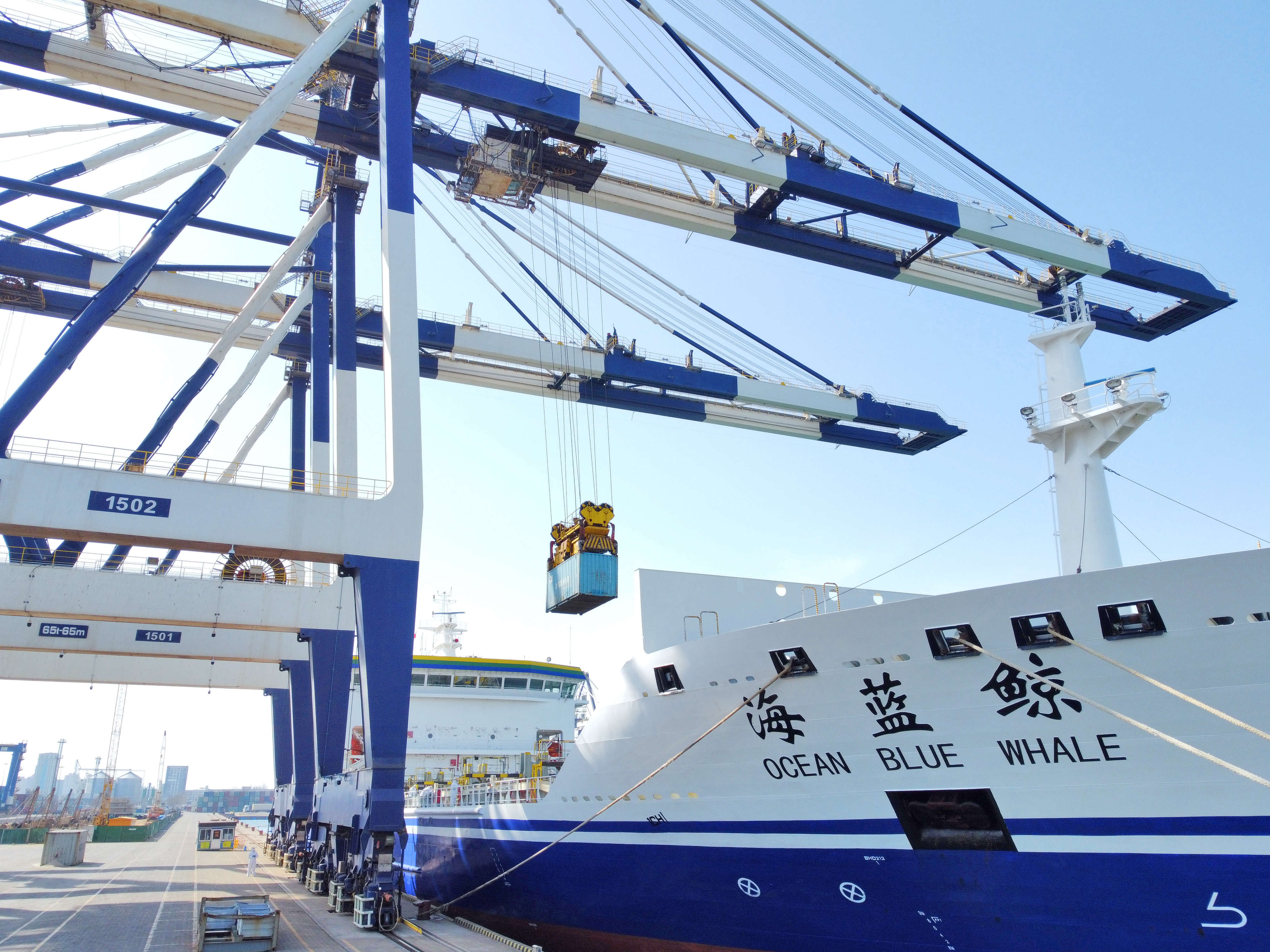 3月22日,山东港口集团烟台港,岸桥为一艘货轮装载集装箱。(唐克摄)