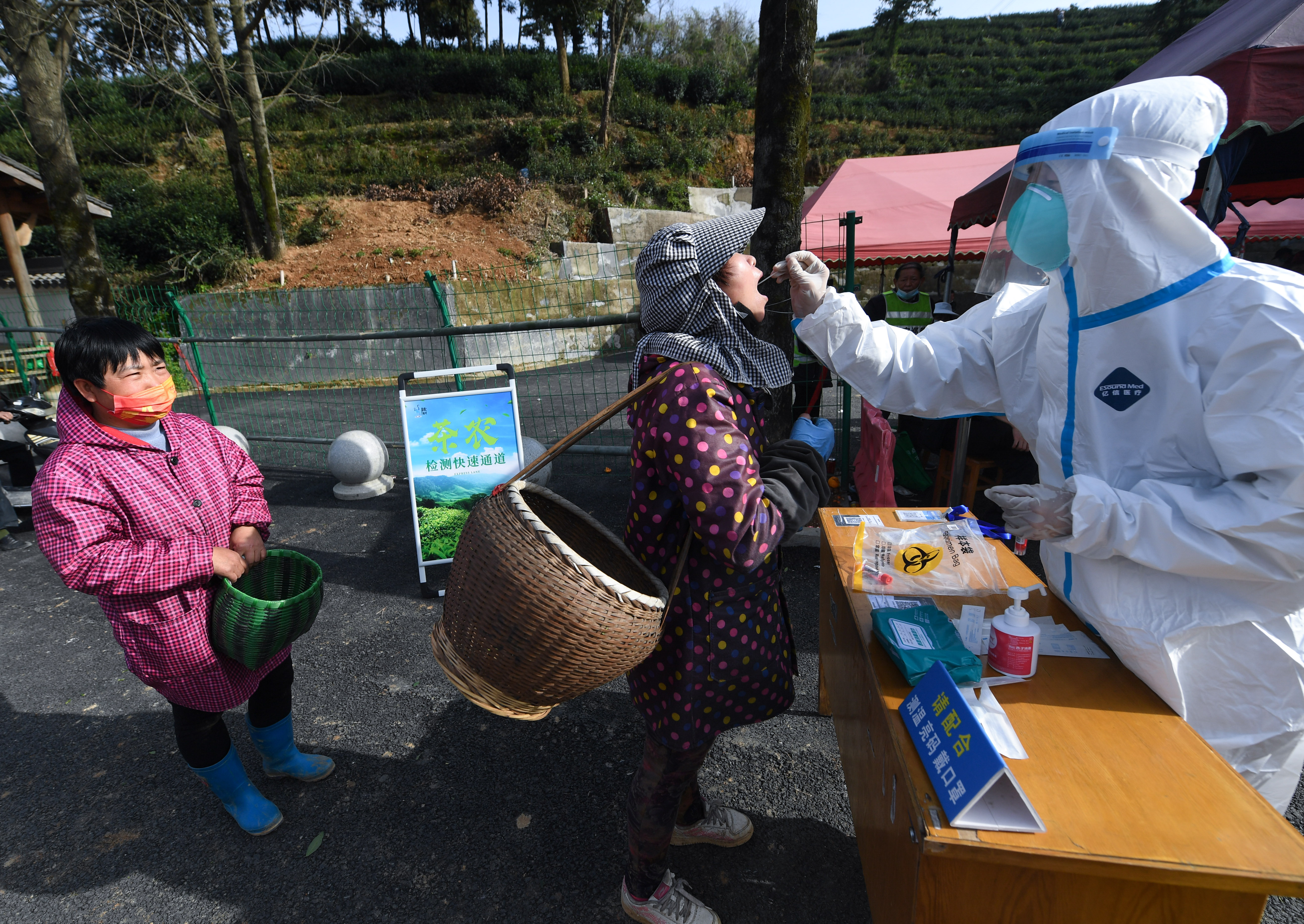 新华社照片,杭州,2022年3月24日 杭州富阳迎来春茶采收季 3月24日,防疫人员在杭州市富阳区银湖街道坑西村茶山边设立的核酸检测“茶农检测快速通道”为采茶工进行核酸采样。 随着气温升高,浙江省杭州市富阳区银湖街道的万亩茶园迎来春茶采收季。3月以来,为确保在疫情防控不放松的同时全力做好春茶生产工作,银湖街道组织有采茶经验的志愿者分批投入到助农采茶工作中,并提前联系包车,分片分点接驳外地采茶工,同时在采茶点现场为茶农开辟核酸检测快速通道。 新华社记者 徐昱 摄