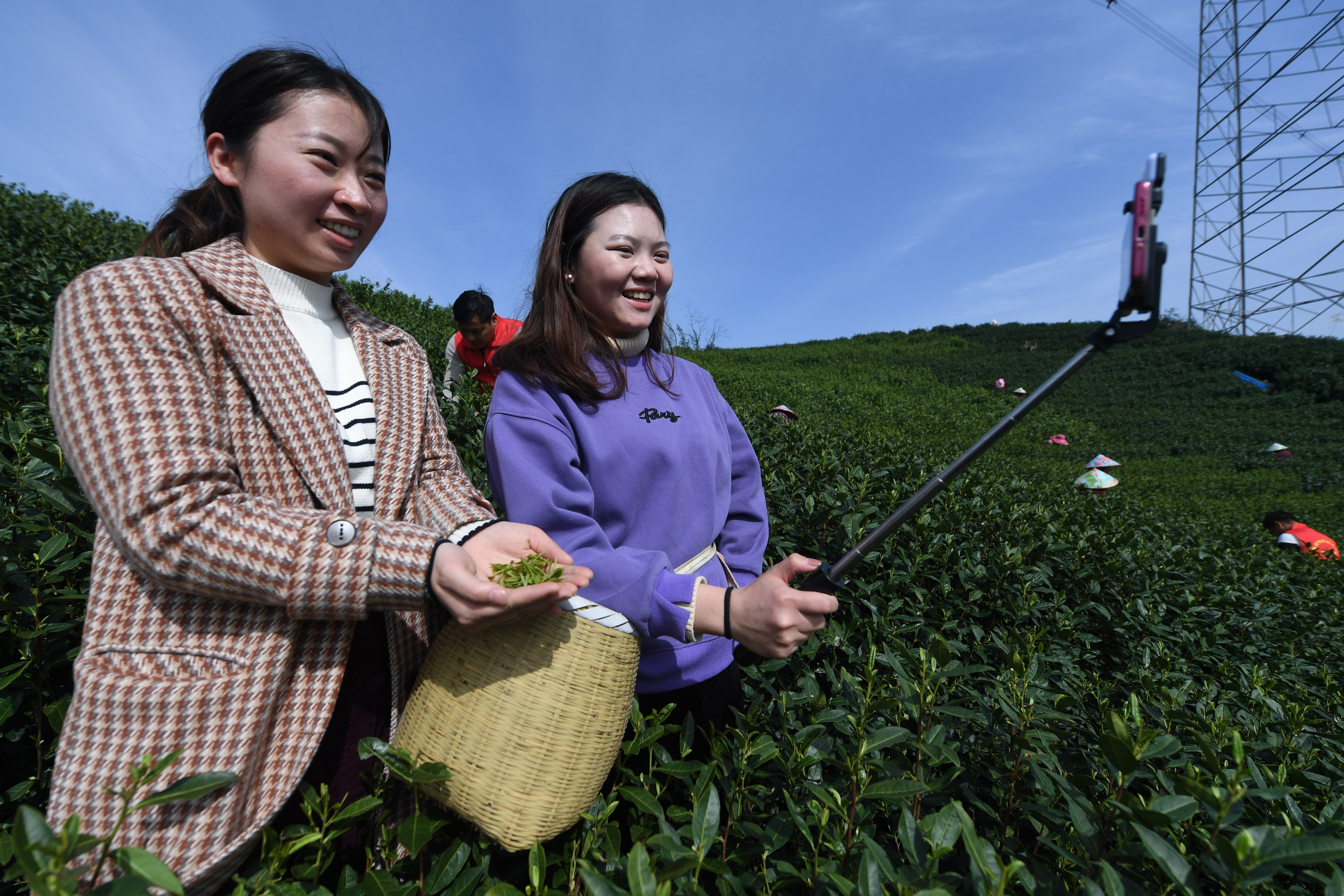 新华社照片,杭州,2022年3月24日 杭州富阳迎来春茶采收季 3月24日,在杭州市富阳区银湖街道坑西村的茶山上,来自街道的志愿者进行直播推介,帮助销售本地特色春茶。 随着气温升高,浙江省杭州市富阳区银湖街道的万亩茶园迎来春茶采收季。3月以来,为确保在疫情防控不放松的同时全力做好春茶生产工作,银湖街道组织有采茶经验的志愿者分批投入到助农采茶工作中,并提前联系包车,分片分点接驳外地采茶工,同时在采茶点现场为茶农开辟核酸检测快速通道。 新华社记者 徐昱 摄