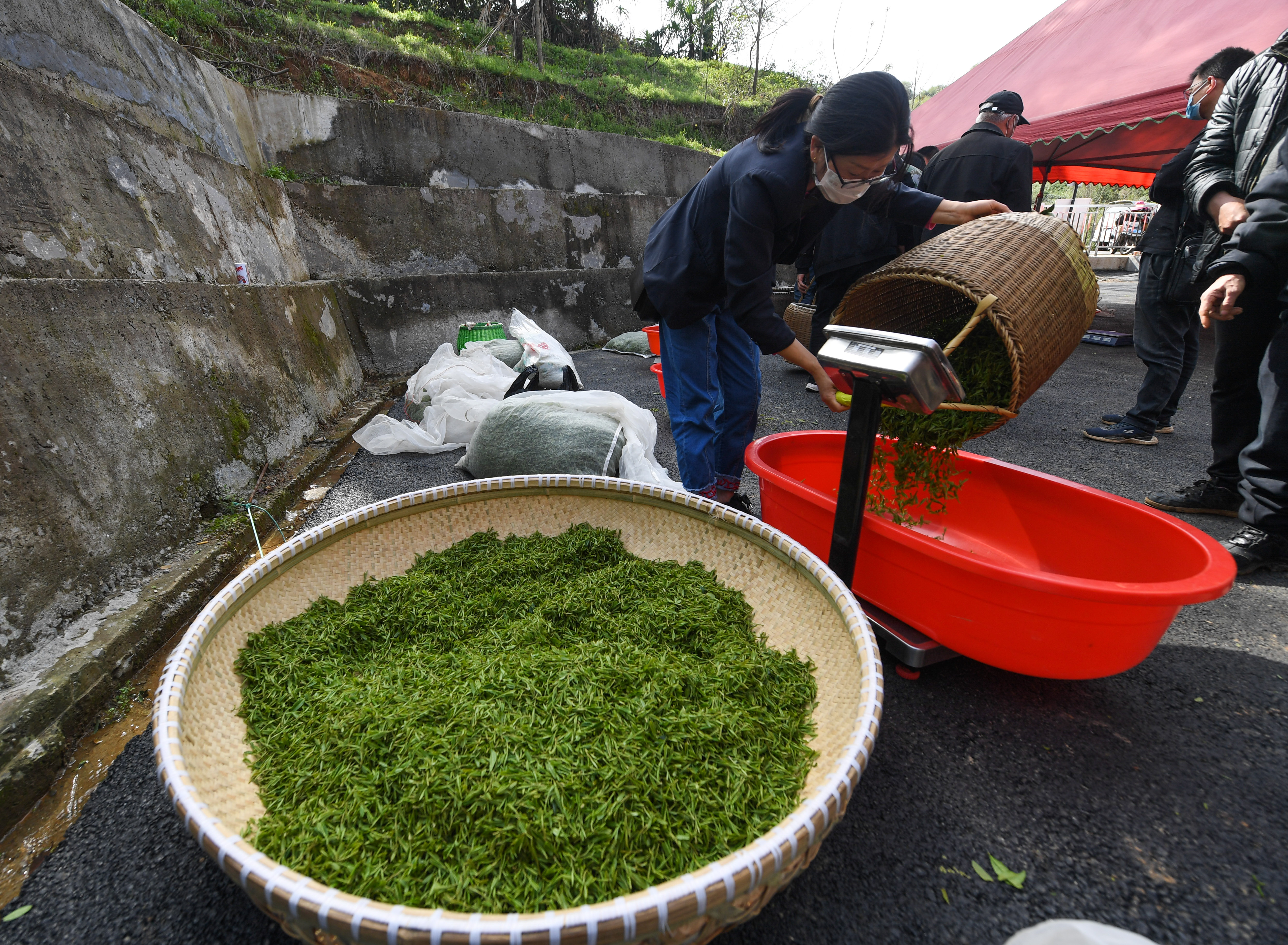 新华社照片,杭州,2022年3月24日 杭州富阳迎来春茶采收季 3月24日,在杭州市富阳区银湖街道坑西村茶山边的鲜叶临时交易市场,茶农在交易刚刚采收的春茶鲜叶。 随着气温升高,浙江省杭州市富阳区银湖街道的万亩茶园迎来春茶采收季。3月以来,为确保在疫情防控不放松的同时全力做好春茶生产工作,银湖街道组织有采茶经验的志愿者分批投入到助农采茶工作中,并提前联系包车,分片分点接驳外地采茶工,同时在采茶点现场为茶农开辟核酸检测快速通道。 新华社记者 徐昱 摄