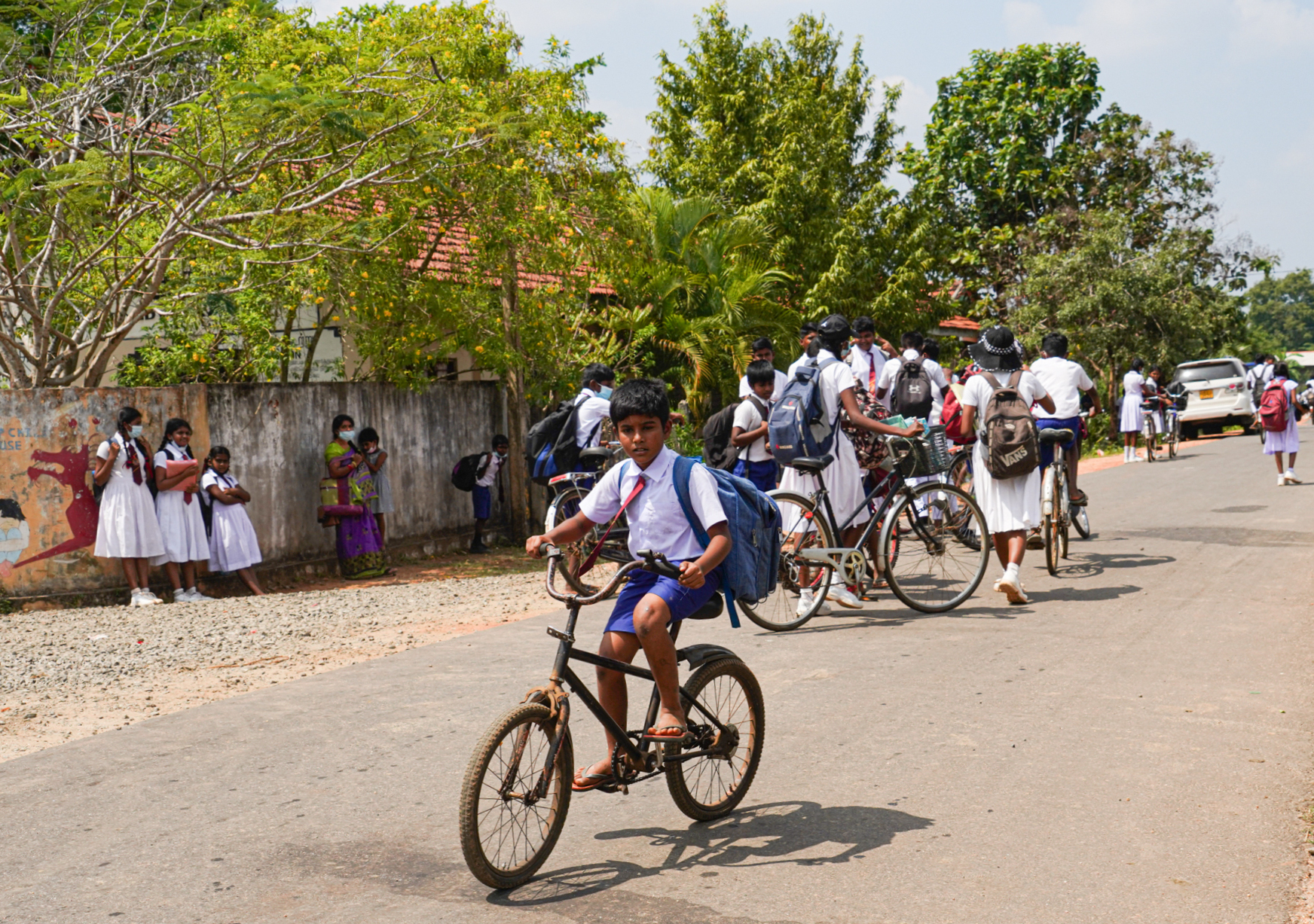 新华社照片,科伦坡,2022年3月24日 (国际·图文互动)(2)通讯:“抚平”乡道带来幸福感——记中企在斯里兰卡北部地区助力升级乡村路 3月11日,在斯里兰卡瓦武尼亚地区,一名学生在学校附近的乡道上骑行。 (配本社同题文字稿) 新华社记者唐璐摄
