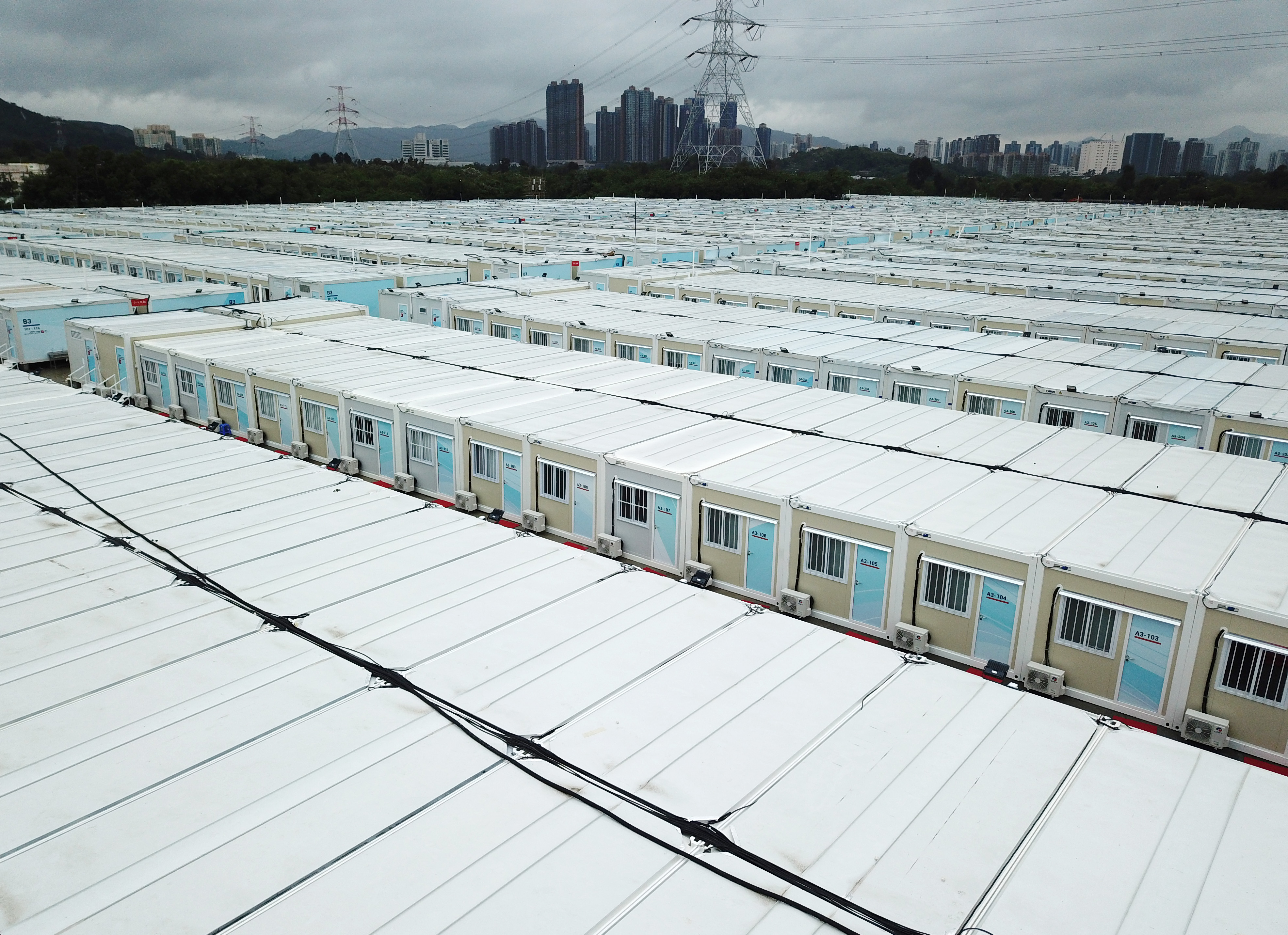 新华社照片,香港,2022年3月24日 中央第一阶段援助香港抗疫医疗设施全面竣工 3月24日拍摄的香港元朗社区隔离设施(无人机照片)。 (配本社同题文字稿) 新华社记者 李钢 摄