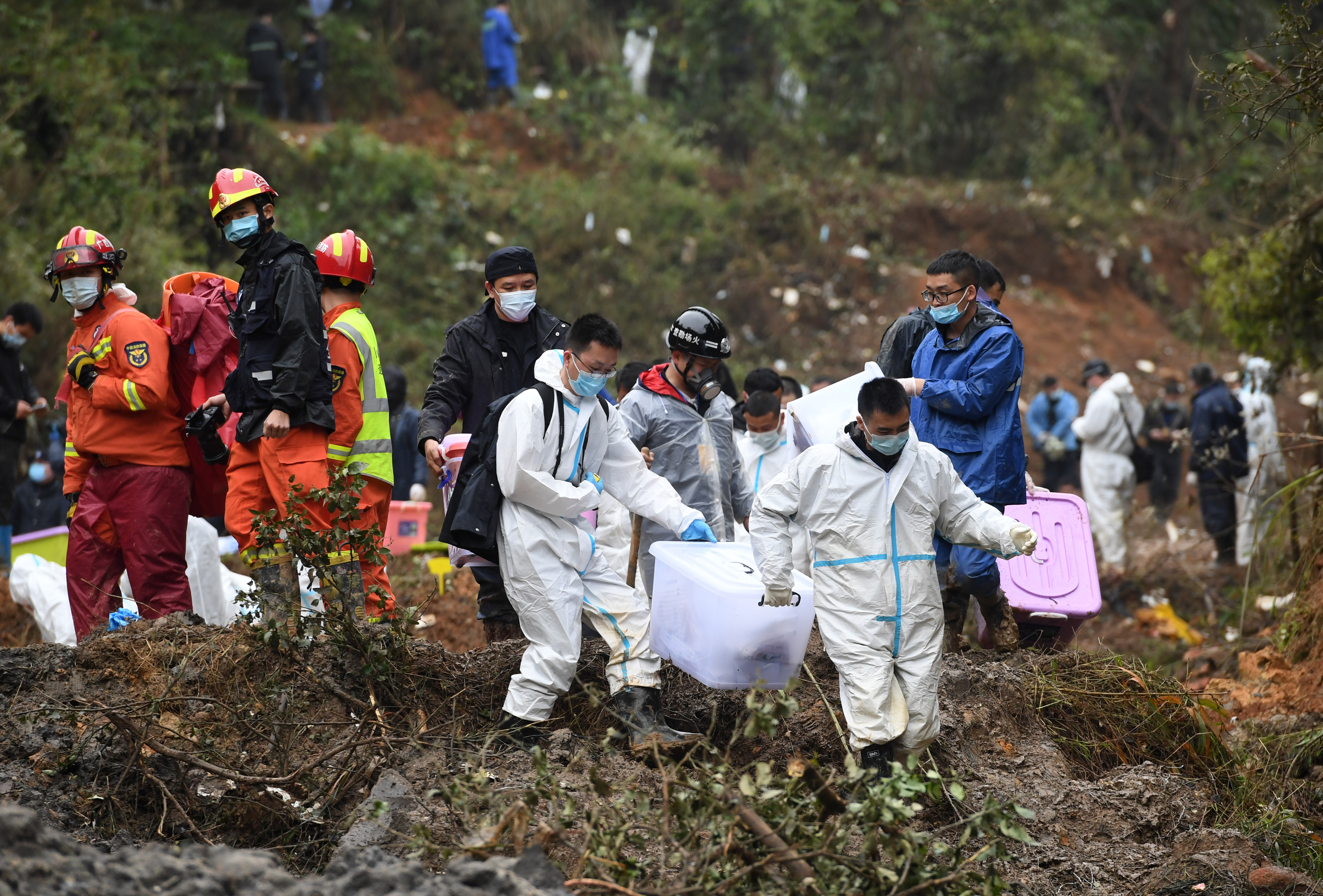 新华社照片,藤县(广西),2022年3月24日 事故核心现场搜索工作继续进行 3月24日,搜救人员在事故核心现场继续进行搜索工作。 3月24日,藤县空难搜寻工作持续展开。搜救人员在广西梧州藤县事故核心区继续搜寻失事飞机的另一个飞行数据记录仪(黑匣子)和相关残骸。 新华社记者 陆波岸 摄