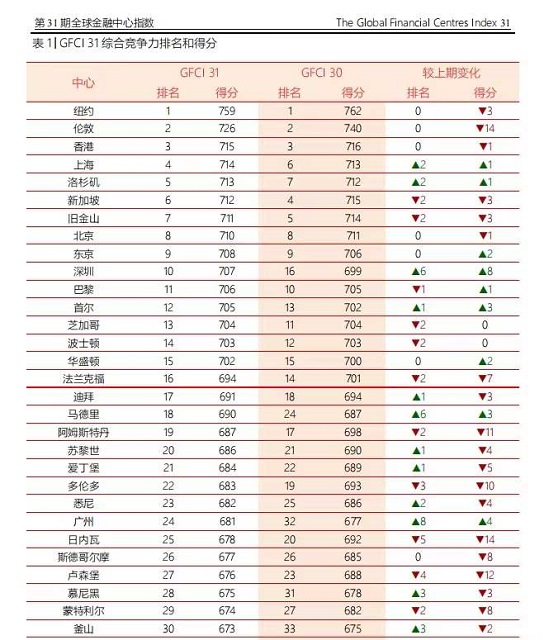 该指数从营商环境、人力资本、基础设施、金融业发展水平、声誉等方面对全球主要金融中心进行了评价和排名。第31期GFCI共有119个金融中心进入榜单,全球前十大金融中心排名依次为:纽约、伦敦、香港、上海、洛杉矶、新加坡、旧金山、北京、东京、深圳。