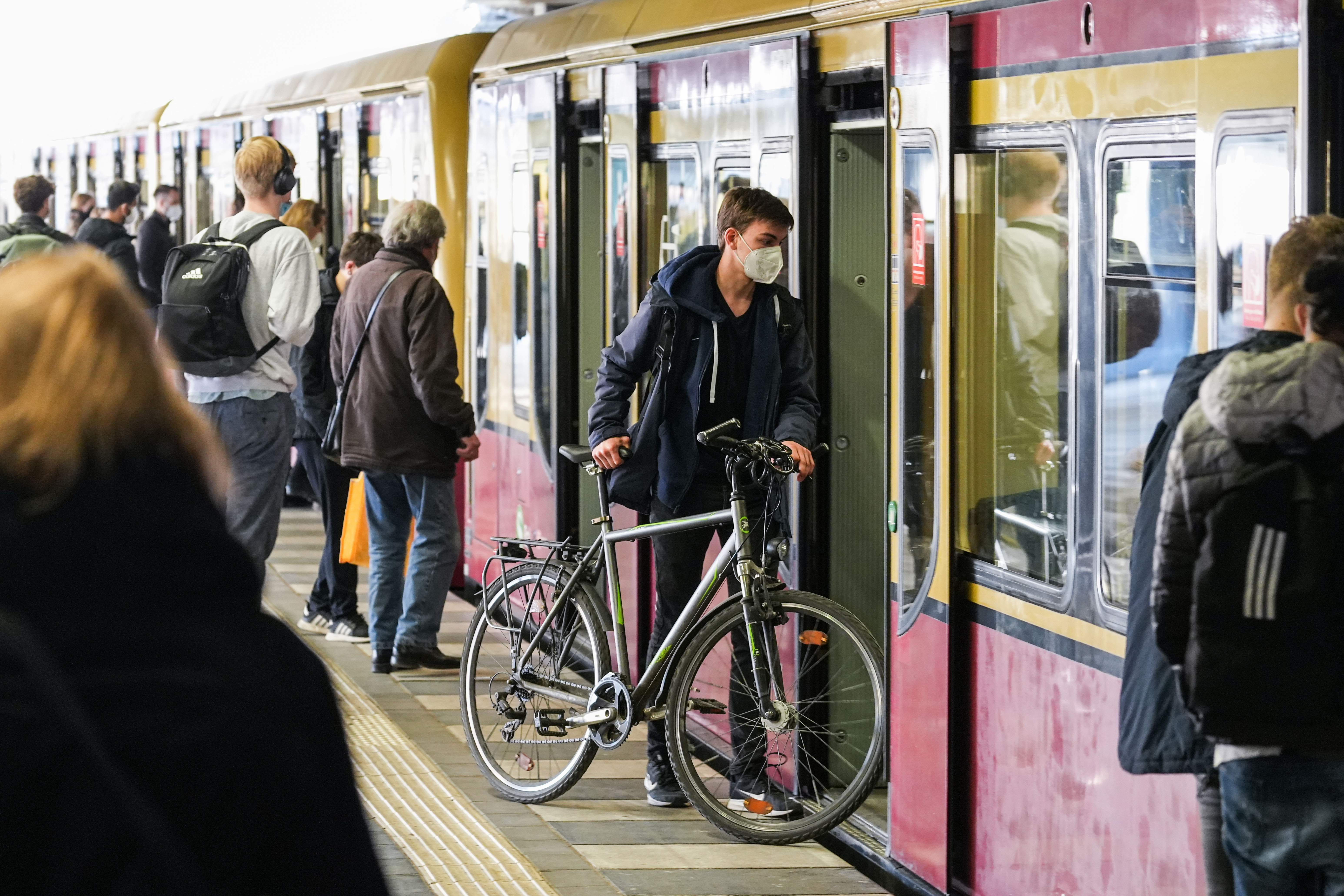 新华社照片,柏林,2022年3月24日 (国际疫情)(2)德国日增新冠确诊病例数首超30万例 3月24日,在德国首都柏林,一名戴口罩的男子搭乘城市快铁列车。 德国疾控机构罗伯特·科赫研究所24日公布的最新疫情数据显示,德国较前一日新增新冠确诊病例318387例,单日新增确诊病例数首次突破30万例。 新华社发(斯特凡·蔡茨摄)