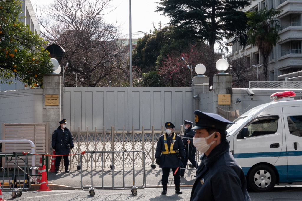 2月23日,在日本东京,警察站在俄罗斯驻日本大使馆外。日本首相岸田文雄23日宣布对俄罗斯实施制裁。新华社记者张笑宇摄