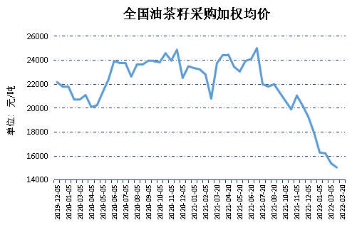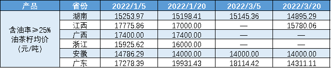 从全国市场看,多数油茶企业已完成油茶籽的集中压榨,目前企业采购油茶籽需求多为年度销售计划的动态调整,按需补货,市场整体需求不足,油茶籽价格有所下行。截至3月20日,含油率在25%以上的油茶籽采购均价为15042.36元/吨,较2月下半月下跌2.21%。