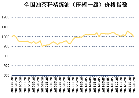 截至3月20日,全国油茶籽精炼油(压榨一级)价格指数报996.98点,较2月下半月1025.93点下跌28.95点,跌幅2.82%,指数小幅下跌;指数较基期下跌3.02点,跌幅0.30%。