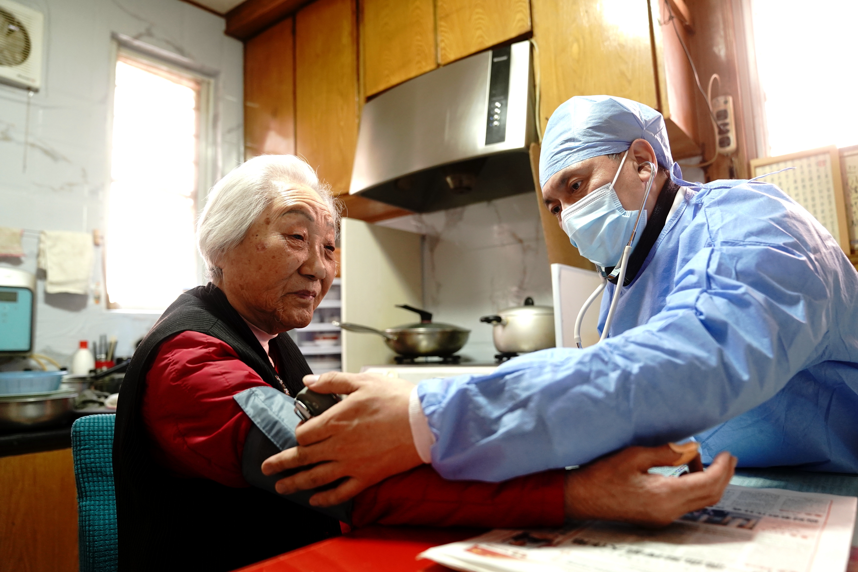 新华社照片,上海,2022年3月25日 上海:家庭医生用心守护社区居民健康 3月24日,上海闵行区古美社区卫生服务中心家庭医生黄鹏宇在平吉一村一名老人家中探访,并为她量血压。 上海本轮疫情期间,社区卫生服务中心的家庭医生们主动摸排封控小区群众医疗健康服务需求,有针对性做好对高血压、糖尿病等慢性病患者以及老人、儿童、孕产妇等的随访服务,用心守护社区居民健康。 新华社记者 张建松 摄