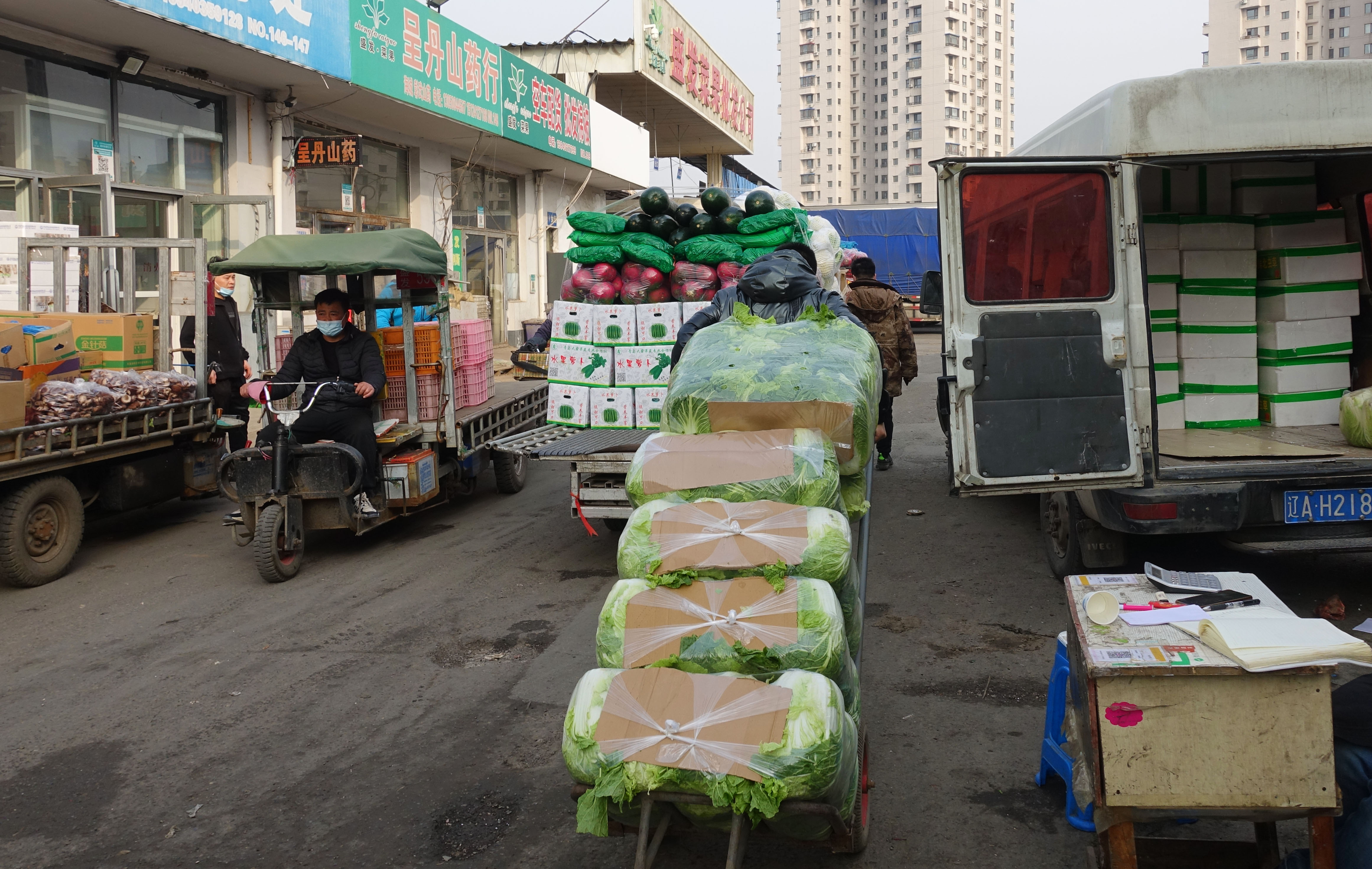 新华社照片,沈阳,2022年3月25日 沈阳全力抗疫:公交系统暂停 保障物资供应 3月23日,在沈阳盛发菜果批发市场,商户在搬运蔬菜。 为抗击本轮疫情,沈阳市新冠肺炎疫情防控指挥部决定3月24日到30日全市公交、地铁、有轨电车暂停运营,全体市民在此期间进行3轮核酸检测,全面加强社会面防控,同时加大粮食、蔬菜等农副产品供应,保障居民正常生活。 新华社记者 翟啸山 摄