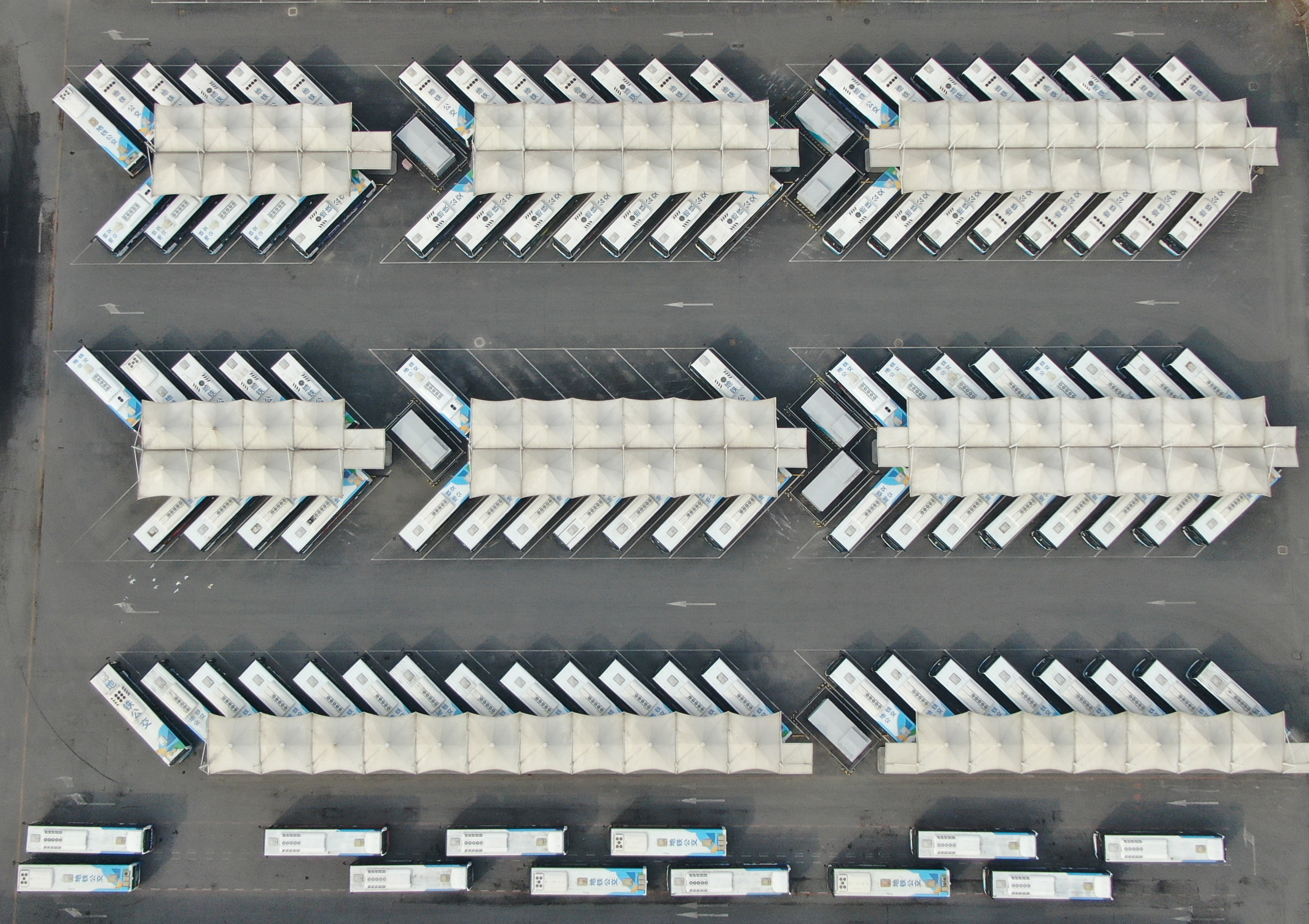 新华社照片,沈阳,2022年3月25日 沈阳全力抗疫:公交系统暂停 保障物资供应 这是3月24日在沈阳一公交车停车场拍摄的公交车(无人机照片)。 为抗击本轮疫情,沈阳市新冠肺炎疫情防控指挥部决定3月24日到30日全市公交、地铁、有轨电车暂停运营,全体市民在此期间进行3轮核酸检测,全面加强社会面防控,同时加大粮食、蔬菜等农副产品供应,保障居民正常生活。 新华社记者 杨青 摄