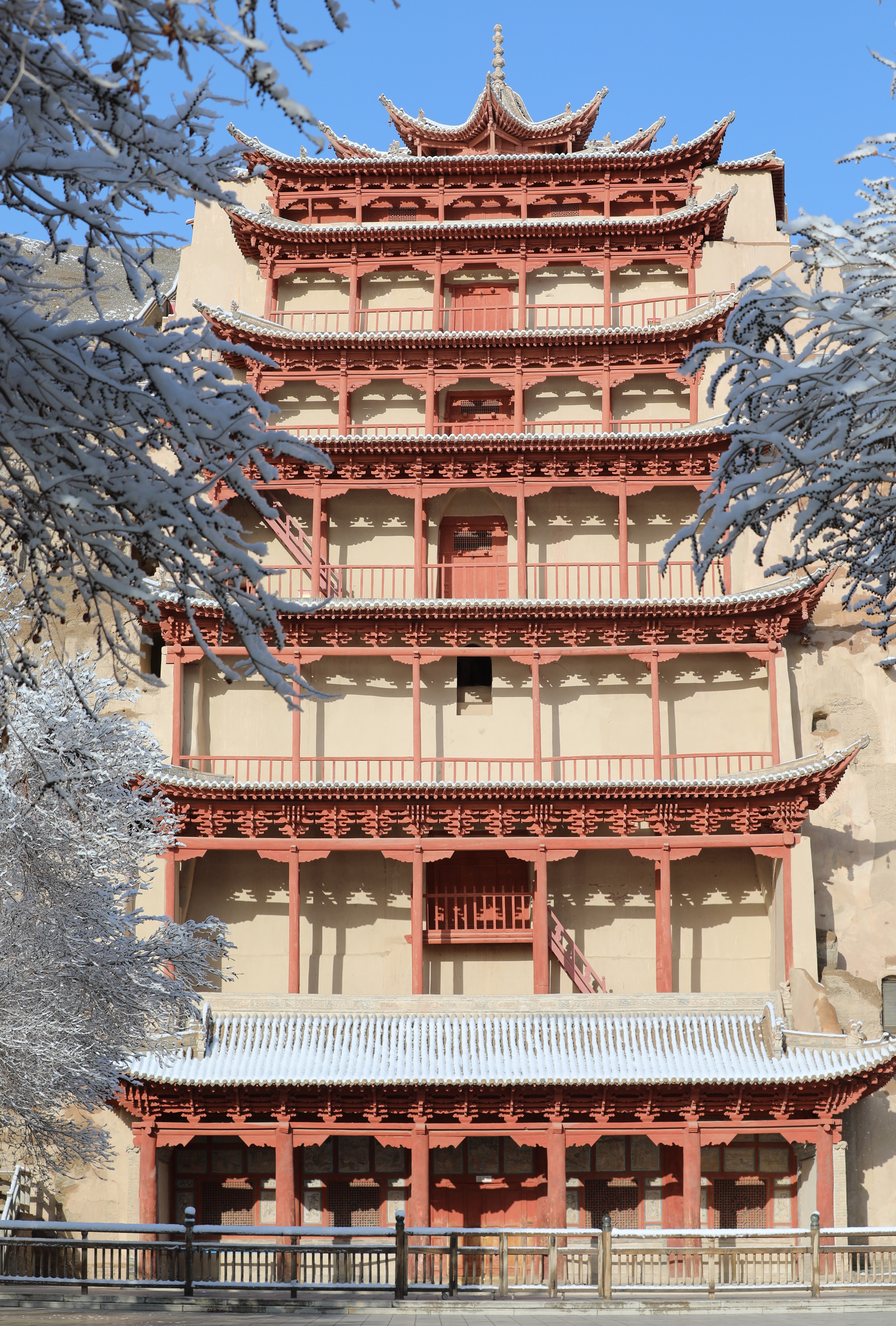 新华社照片,敦煌(甘肃),2022年3月25日 莫高窟春雪 这是3月25日拍摄的雪后的敦煌莫高窟景区九层楼。 3月24日至25日,甘肃省敦煌市迎来一场春雪。雪后的世界文化遗产敦煌莫高窟银装素裹,景色如画。 新华社记者 李俞辉 摄