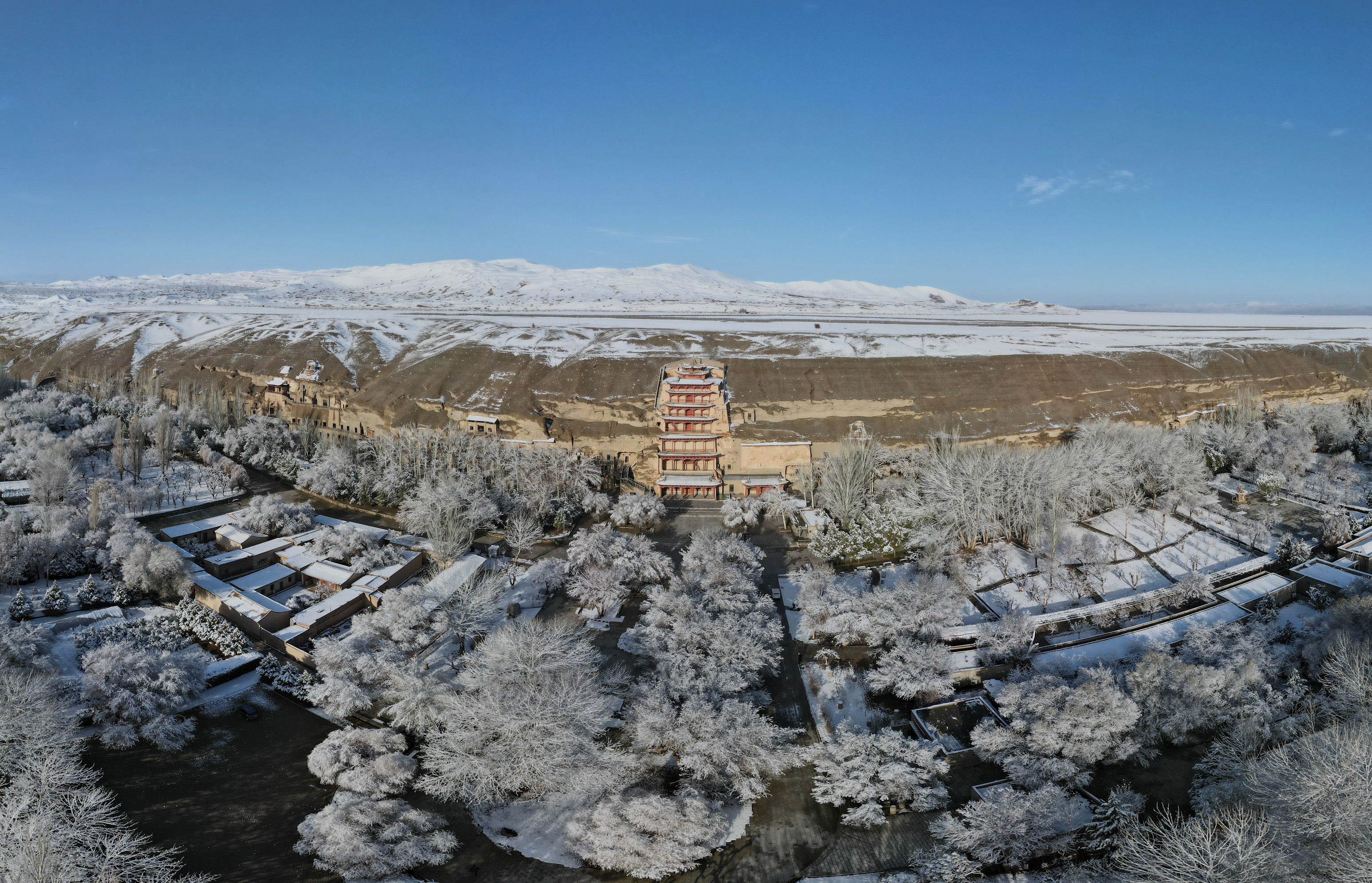 新华社照片,敦煌(甘肃),2022年3月25日 莫高窟春雪 这是3月25日拍摄的敦煌莫高窟景区雪景(无人机照片)。 3月24日至25日,甘肃省敦煌市迎来一场春雪。雪后的世界文化遗产敦煌莫高窟银装素裹,景色如画。 新华社记者 张智敏 摄