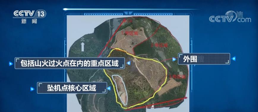 为了尽快找到第二个黑匣子,救援人员以主要撞击点为中心,扩大搜索半径范围,开展拉网式搜寻。图中的白圈区域为坠机点核心区,目前由专家进行重点发掘。黄圈区域为包括山火过火点在内的重点区域,1号、2号、3号区域为外围搜寻区域,目前多方力量在进行大范围搜寻。