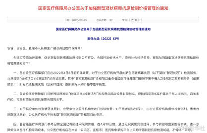 【国家医保局:#新冠抗原检测价格项目不高于每人次5元#】据国家医保局最新消息,各省级医疗保障部门应在2022年4月8日前明确政策,对于公立医疗机构开展的新型冠状病毒抗原检测服务,允许按照“价格项目+检测试剂”的方式收费。其中“新冠抗原检测”价格项目由各省级医疗保障部门按照不高于每人次5元制定政府指导价(最高限价);新冠抗原检测试剂(含采样器具)按照实际采购价格零差率销售。(记者彭韵佳)