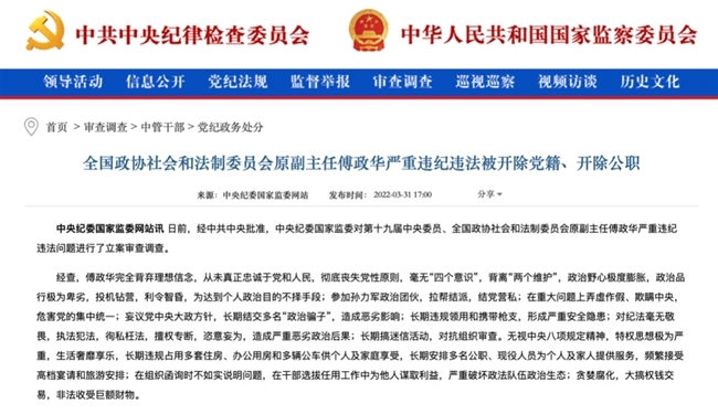 傅政华被双开了。昨晚中央纪委国家监委发出700字长篇通报,措辞相当严厉,诸如“政治野心极度膨胀,政治品行极为卑劣,投机钻营,利令智昏,为达到个人政治目的不择手段”“参加孙力军政治团伙,拉帮结派,结党营私”“长期搞迷信活动,对抗组织审查”等。