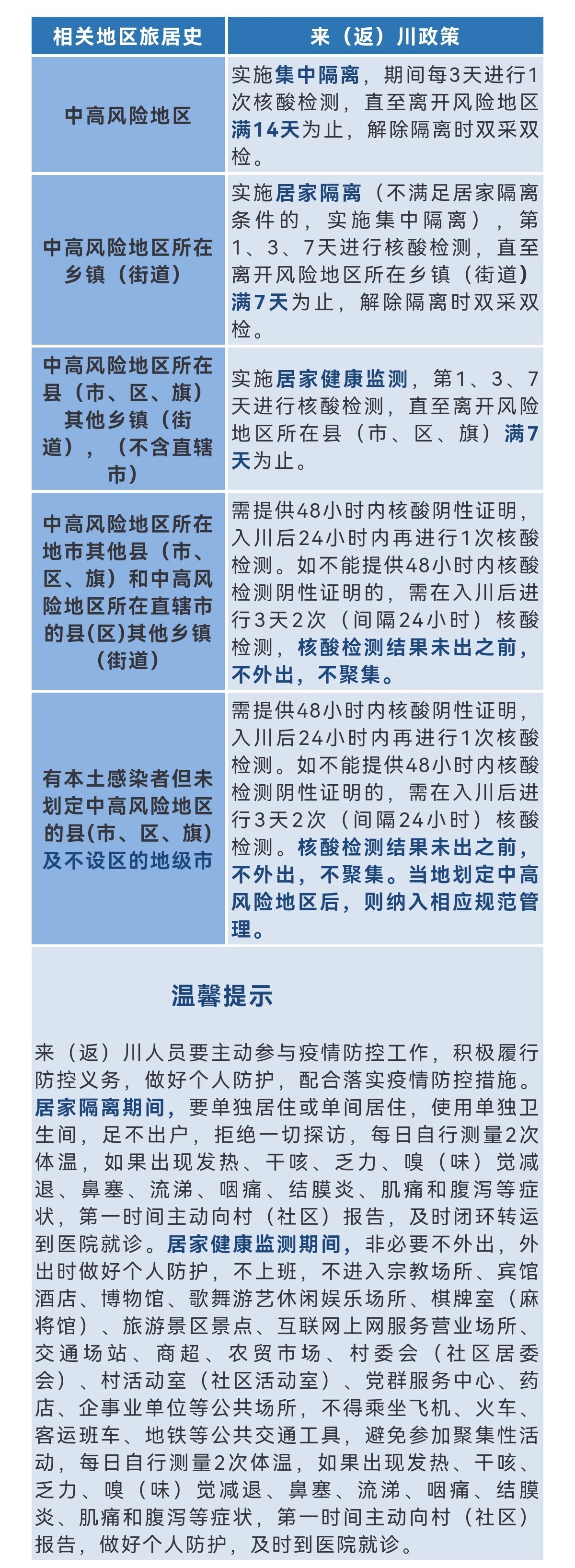 请省外来返川人员(特别是从近14天内有阳性感染者的地市来返川人员)在24小时内尽快做一次核酸检测,结果未出之前不外出,不聚集。