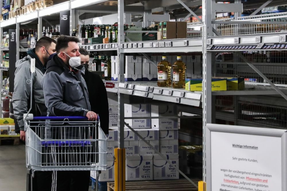 3月26日,在德国首都柏林的一家超市,顾客站在商品短缺的食用油货架前。随着西方不断升级对俄制裁,能源价格上涨也波及食品、日用品等与生活息息相关的领域。新华社记者单宇琦摄
