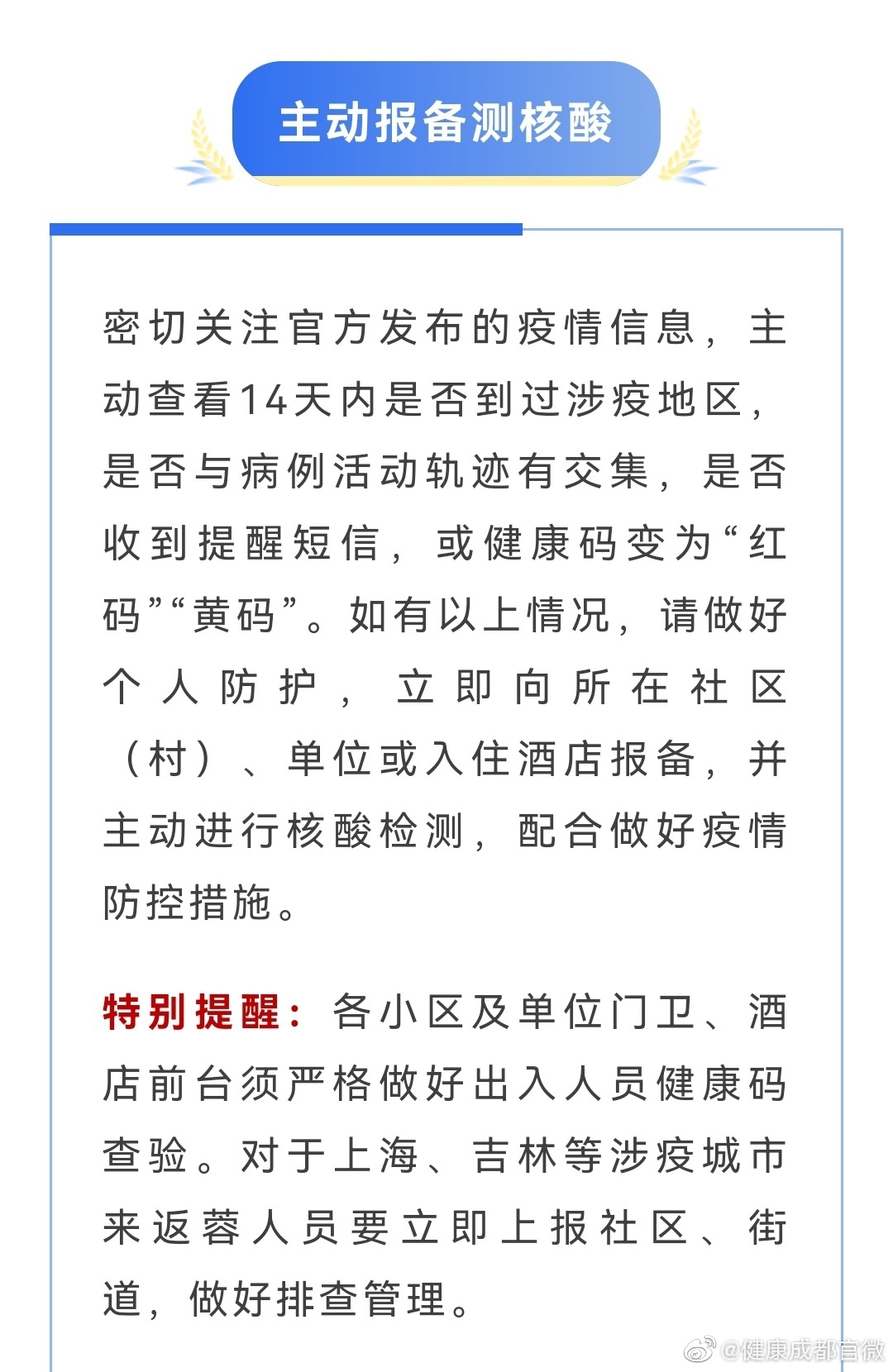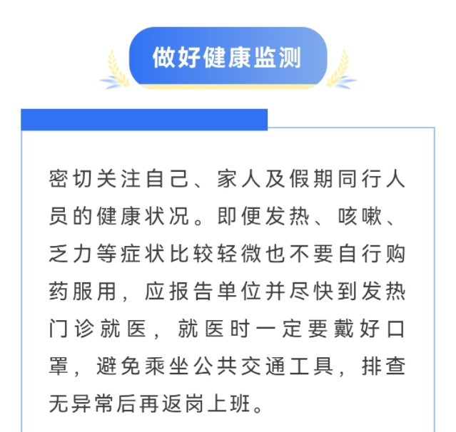成都市疾病预防控制中心提醒:短暂的清明假期就要结束了,即将回归工作的朋友们,返岗后一定要注意健康监测,做好个人防护,不给病毒可趁之机。
