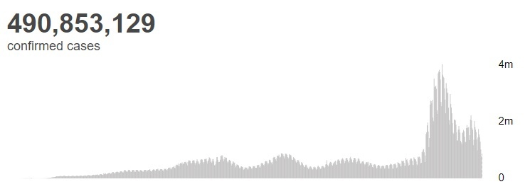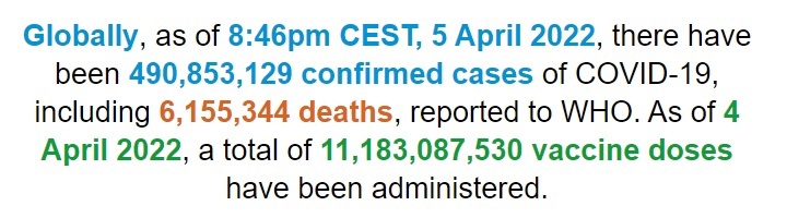 根据世卫组织最新实时统计数据,截至欧洲中部夏令时间4月5日20时46分(北京时间4月6日2时46分),全球累计新冠肺炎确诊病例490853129例,累计死亡病例6155344例。5日全球新增新冠肺炎确诊病例872868例,新增死亡病例16079例。(总台记者 朱赫)