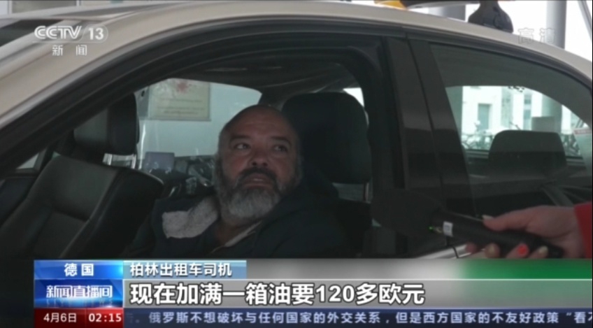 德国柏林出租车司机:(油价)肯定是比之前贵了,我感觉贵了大概30%左右 。现在加满一箱油要120多欧元 (约合840元人民币),之前只要大概90欧元。