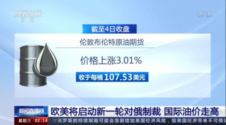 受到新一轮对俄制裁消息影响,国际油价4月4日显著上涨。截至当天收盘,纽约商品交易所原油期货价格上涨4.04%,收于每桶103.28美元;伦敦布伦特原油期货价格上涨3.01%,收于每桶107.53美元。5日,国际油价延续了上涨势头,截至北京时间5日19时,纽约商品交易所原油期货价格上涨1.36%,到每桶104.68美元;伦敦布伦特原油期货价格上涨0.98%,到每桶108.58美元。