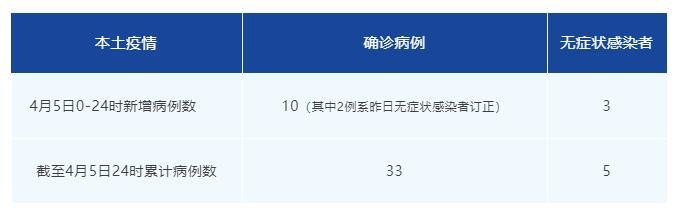 4月5日0-24时,我市新增本土确诊病例10例(其中2例系昨日通报的无症状感染者订正),新增本土无症状感染者3例。截至4月5日24时,我市本轮疫情累计报告本土确诊病例33例,本土无症状感染者5例。