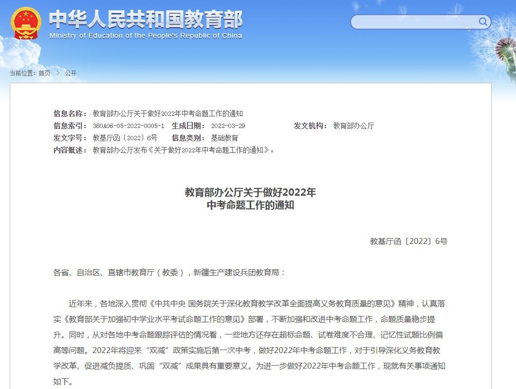 近年来,各地深入贯彻《中共中央 国务院关于深化教育教学改革全面提高义务教育质量的意见》精神,认真落实《教育部关于加强初中学业水平考试命题工作的意见》部署,不断加强和改进中考命题工作,命题质量稳步提升。同时,从对各地中考命题跟踪评估的情况看,一些地方还存在超标命题、试卷难度不合理、记忆性试题比例偏高等问题。2022年将迎来“双减”政策实施后第一次中考,做好2022年中考命题工作,对于引导深化义务教育教学改革、促进减负提质、巩固“双减”成果具有重要意义。为进一步做好2022年中考命题工作,现就有关事项通知如下。