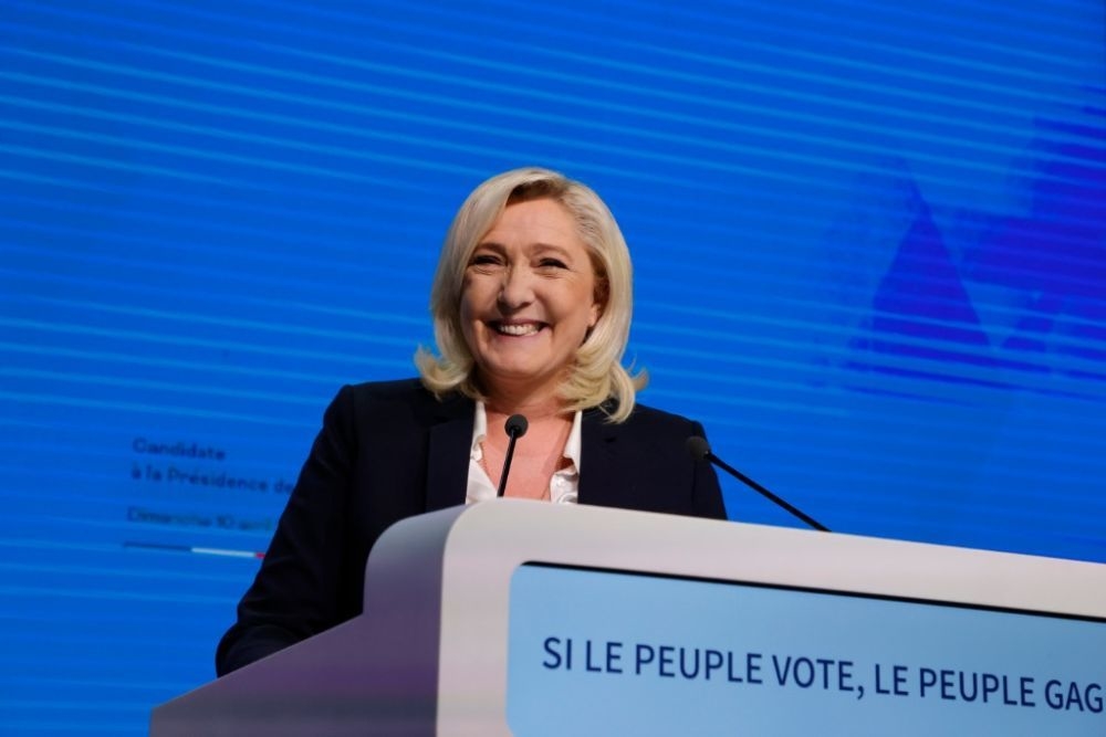 4月10日,法国极右翼政党“国民联盟”候选人玛丽娜·勒庞在巴黎参加总统选举首轮投票后的集会。新华社发(里特·艾斯摄)