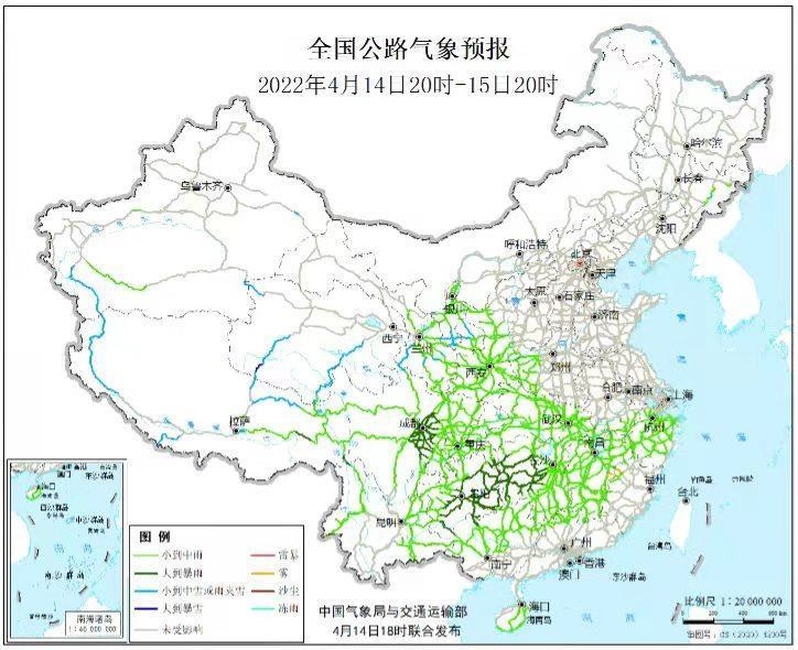 记者从交通运输部了解到,4月14日20时至15日20时,青海中南部、西北地区东北部、西藏西部和北部等地部分地区有小到中雪或雨夹雪,局地有大雪。西藏东南部、西北地区东南部、江南西北部、西南地区东部和北部等地的部分地区有中到大雨,其中,西藏东南部、云南西北部、湖南西部、贵州东部和西南部等地部分地区有暴雨。另外,福建西部、江西东部等地局地有雾。