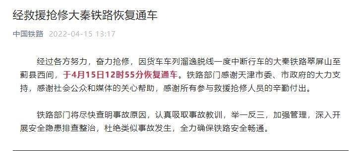 据中国铁路官微消息,经过各方努力,奋力抢修,因货车车列溜逸脱线一度中断行车的大秦铁路翠屏山至蓟县西间,于4月15日12时55分恢复通车。铁路部门感谢天津市委、市政府的大力支持,感谢社会公众和媒体的关心帮助,感谢所有参与救援抢修人员的辛勤付出。