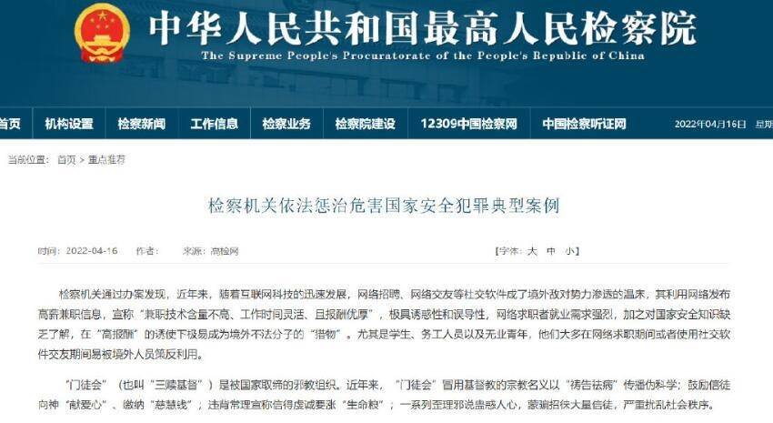 最高检16日发布了检察机关依法惩治危害国家安全犯罪典型案例。