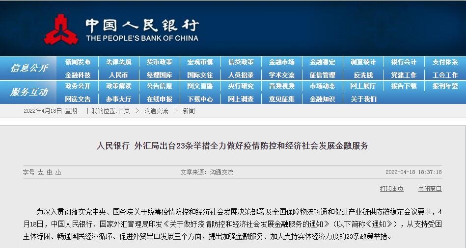 为深入贯彻落实党中央、国务院关于统筹疫情防控和经济社会发展决策部署及全国保障物流畅通和促进产业链供应链稳定会议要求,4月18日,中国人民银行、国家外汇管理局印发《关于做好疫情防控和经济社会发展金融服务的通知》(以下简称《通知》),从支持受困主体纾困、畅通国民经济循环、促进外贸出口发展三个方面,提出加强金融服务、加大支持实体经济力度的23条政策举措。