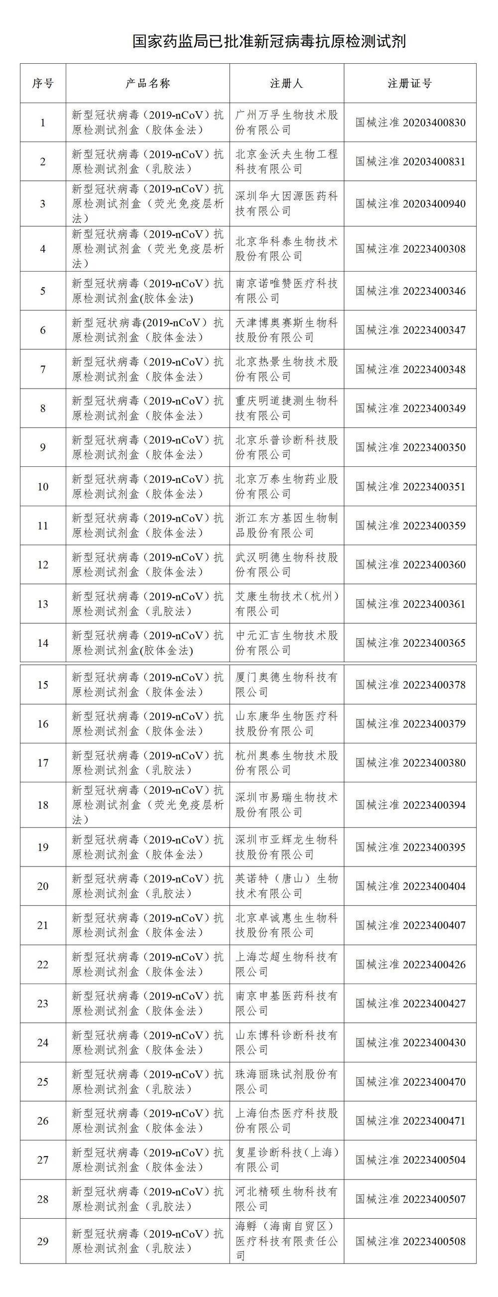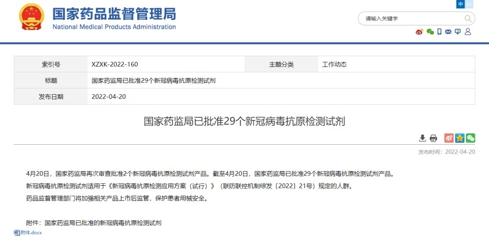 4月20日,国家药监局再次审查批准2个新冠病毒抗原检测试剂产品。截至4月20日,国家药监局已批准29个新冠病毒抗原检测试剂产品。